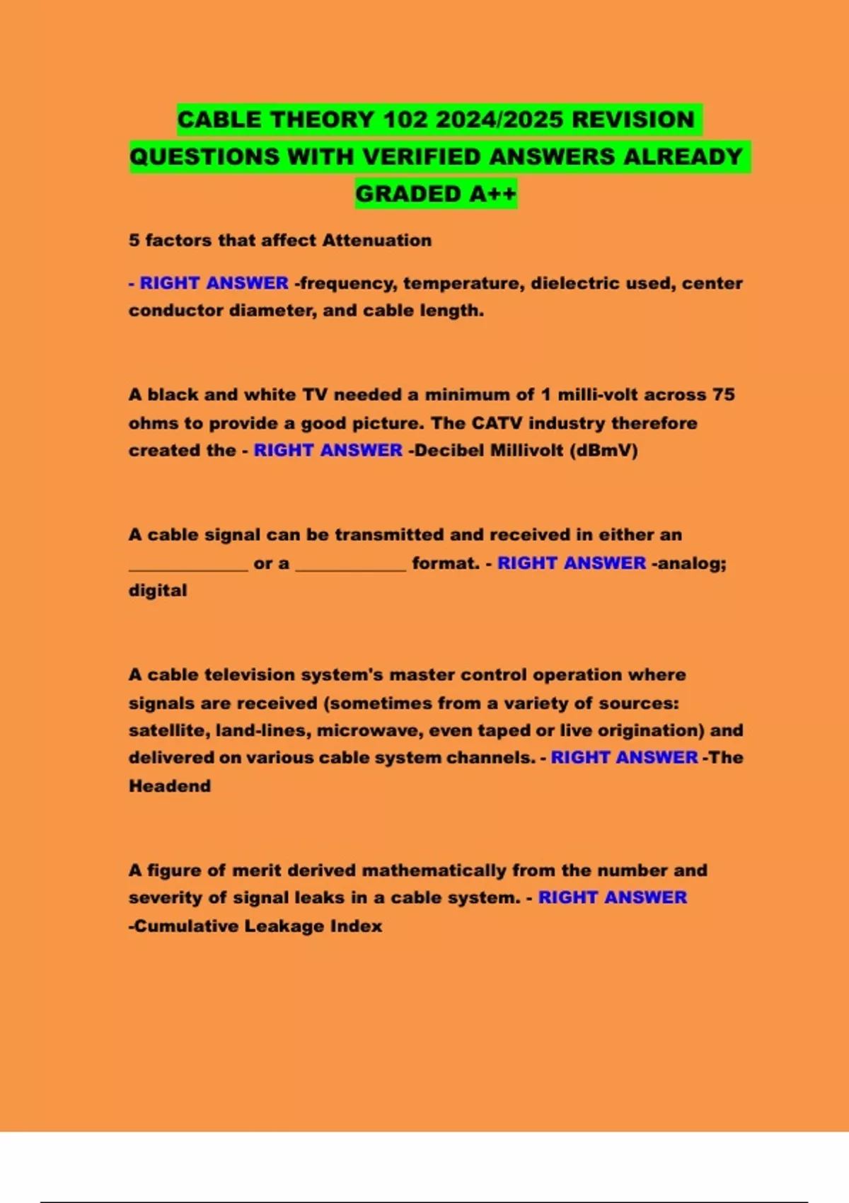 CABLE THEORY 102 2024/2025 REVISION QUESTIONS WITH VERIFIED ANSWERS ALREADY GRADED A++ 5 factors that affect Attenuation - RIGHT ANSWER -frequency, temperature, dielectric used, center conductor diameter, and cable length. A black and white TV needed a minimum of 1 milli-volt across 75 ohms to provide a good picture. The CATV industry therefore created the - RIGHT ANSWER -Decibel Millivolt (dBmV) A cable signal can be transmitted and received in either an ______________ or a _____________ format. - RIGHT ANSWER -analog; digital A cable television system's master control operation where signals are received (sometimes from a variety of sources: satellite, land-lines, microwave, even taped or live origination) and delivered on various cable system channels. - RIGHT ANSWER -The Headend A figure of merit derived mathematically from the number and severity of signal leaks in a cable system. - RIGHT ANSWER -Cumulative Leakage Index A list of channel numbers and their associated stations for a particular headend. - RIGHT ANSWER -Channel map A mandate by the Federal Communications Commission which requires cable operators only deploy digital set-top boxes that have a PC card slot for a multichannel CableCARD, to decrypt channels. - RIGHT ANSWER -Separable Security A network architecture developed by the cable industry, which typically uses fiber optic cables to bring signals to selected areas of the system called nodes, which are usually based on the number of subscribers to be served. An advantage of fiber is that it has bandwidth many times greater than coaxial cable and can travel great distances without amplification. From the node, conventional coaxial cable, and amplifiers where required, deliver the signals to the feeder cables. - RIGHT ANSWER -Hybrid Fiber-Coaxial (HFC) A range of frequencies - RIGHT ANSWER -Frequency Band A removable security card available from cable TV providers. - RIGHT ANSWER -CableCARDTM A signal modulated at the sender's end must be demodulated at the receiver's end to extract the - RIGHT ANSWER -information the wave carries a sound wave or musical note is characterized by its _______________ (strength) and ______________ (pitch). - RIGHT ANSWER -amplitude; frequency A specification developed for protecting digital entertainment content that travels over HDMI cables. HDCP encrypts the transmission of digital content between the video source or transmitter (such as a computer, DVD player or Xfinity digital receiver) and the digital display, or receiver (such as a monitor, television or projector). - RIGHT ANSWER -High-Bandwidth Digital Content Protection Absolute signal power that describes the signal at a specific location - RIGHT ANSWER -Decibel Millivolt (dBmV) All newer Xfinity set-top boxes have these cards installed in them. It is this card that translates encrypted signals on the Comcast network. - RIGHT ANSWER -CableCARDTM AM - RIGHT ANSWER -Amplitude Modulation Radio An electromagnetic signal above the audio and below the infrared frequencies. - RIGHT ANSWER -RF or Radio Frequency An electromagnetic wave used to transport information from one point to another. It is therefore a controlled variation of electrical energy over time. - RIGHT ANSWER -RF signal An unwanted alteration of the original shape of a signal, is usually caused by the medium it travels through. - RIGHT ANSWER -Signal distortion Analog waveforms have an infinite number of ______________ and ________________ variations. - RIGHT ANSWER -frequency; amplitude Any of the key elements of the signal, such as _______________or ______________, can be changed to get the modulated signal - RIGHT ANSWER -amplitude; frequency Any technology used to protect the interests of owners of content and services (such as copyright owners). Typically, authorized recipients or users must acquire a license in order to consume the protected material—files, music, movies—according to the rights or business rules set by the content owner. - RIGHT ANSWER -Digital Rights Management Architecture, which allows the transmission of several services, such as analog and digital TV, video-on-demand, voice, and high-speed data. - RIGHT ANSWER -Hybrid Fiber-Coaxial (HFC) As a result, though the quality of MPEG-4 compression is much higher than MPEG-2, the distortion lasts __________ if a frame is corrupted during transmission due to the amount of time between key frames - RIGHT ANSWER -longer BER - RIGHT ANSWER -Bit-Error Rate CAE - RIGHT ANSWER -Customer Account Executive Can upgrade or downgrade a customer's level of service with a change to their billing/account information. - RIGHT ANSWER -CAE carry information about which pixels change in relation to the i-frame for transmitted and to-be-transmitted frames - RIGHT ANSWER -B - pictures (bi-directional frames) CFR - RIGHT ANSWER -Code of Federal Regulations CLI - RIGHT ANSWER -Cumulative Leakage Index Code of Federal Regulations the FCC uses to monitor our leakage - RIGHT ANSWER -(CFR), Title 47, Part 76, Cable Television Service regulation Comcast uses the following frequency bands for Forward Path (Downstream) on Legacy Systems : - RIGHT ANSWER -54 up to 1002 MHz Comcast uses the following frequency bands for Forward Path (Downstream) on Mid-Split Systems : - RIGHT ANSWER -54 up to 1.2 GHz Comcast uses the following frequency bands for Return Path (Upstream) on Legacy Systems : - RIGHT ANSWER -5 to 42 MHz Comcast uses the following frequency bands for Return Path (Upstream) on Mid-Split Systems : - RIGHT ANSWER -5 to 85 MHz contain all the information to be transmitted and serve as reference points - RIGHT ANSWER -I - pictures (key frames) Controls the level of service received by the customer by allowing or blocking specific channels or services. - RIGHT ANSWER -Signal security dB - RIGHT ANSWER -Decibel dBmV - RIGHT ANSWER -Decibel Millivolt Degradation of a signal quality may occur due to interference - RIGHT ANSWER -Ingress Degradation of a signal quality may occu
