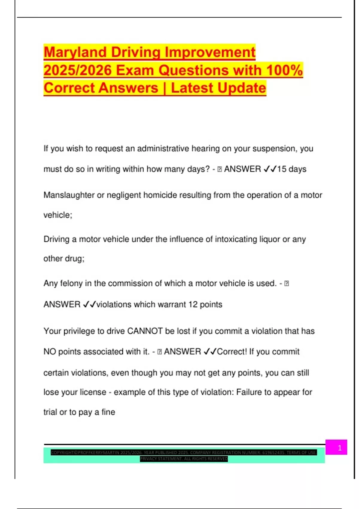 Maryland Driving Improvement 2025/2026 Exam Questions with 100% Correct Answers | Latest Update