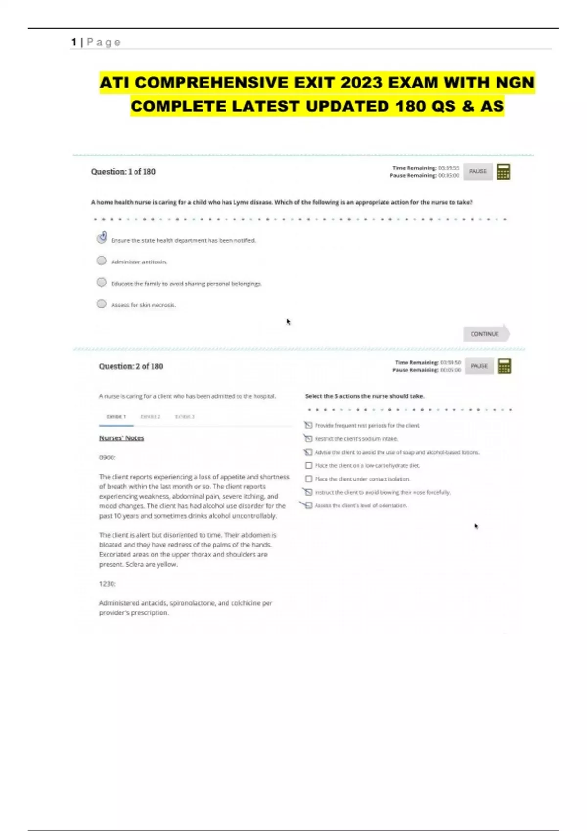 ATI COMPREHENSIVE EXIT 2023 EXAM WITH NGN COMPLETE LATEST UPDATED 180 QS & AS