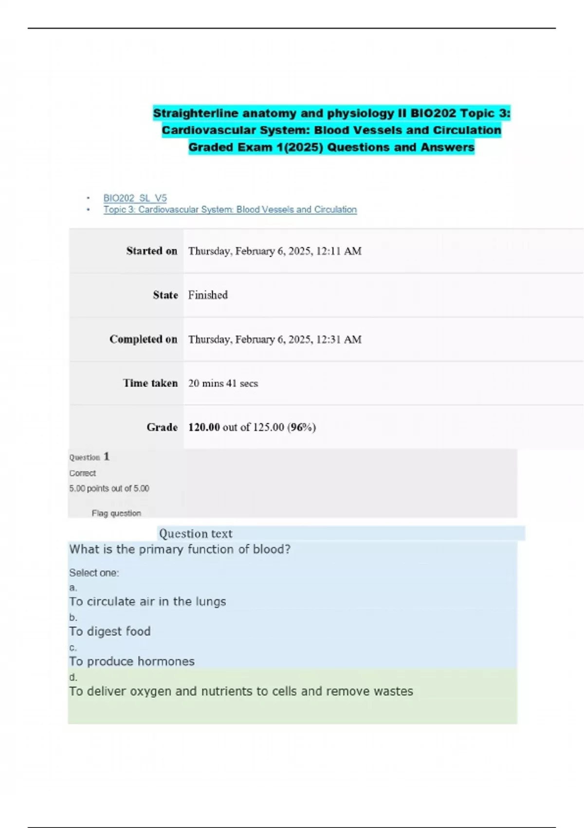Straighterline anatomy and physiology II BIO202 Topic 3: Cardiovascular System: Blood Vessels and Circulation Graded Exam 1(2025) Questions and Answers