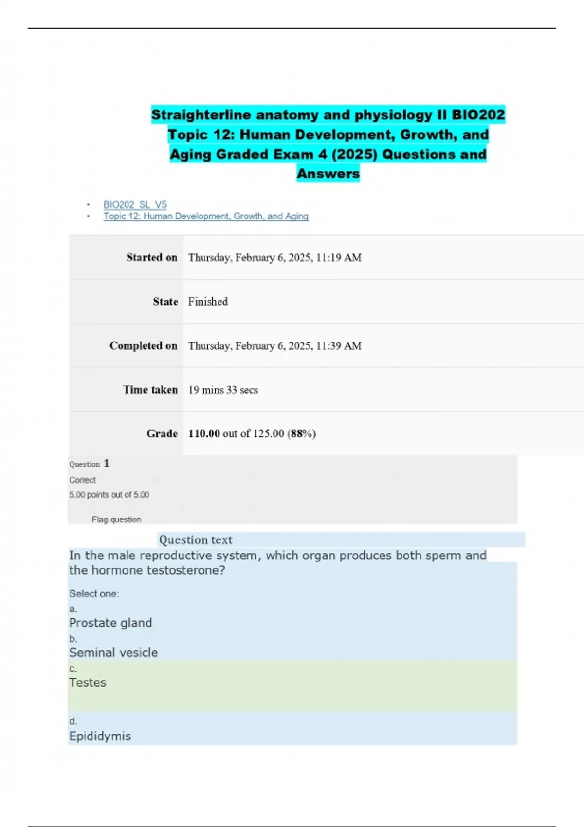 Straighterline anatomy and physiology II BIO202 Topic 12: Human Development, Growth, and Aging Graded Exam 4 (2025) Questions and Answers