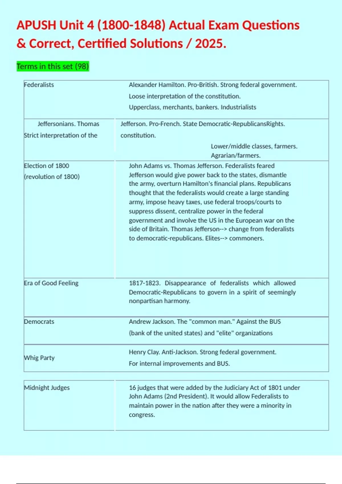 Terms in this set (98) Federalists Alexander Hamilton. Pro-British. Strong federal government. Loose interpretation of the constitution. Upperclass, merchants, bankers. Industrialists Jeffersonians. Thomas Jefferson. Pro-French. State Democratic-RepublicansRights. Strict interpretation of the constitution. Lower/middle classes, farmers. Agrarian/farmers. Election of 1800 (revolution of 1800) John Adams vs. Thomas Jefferson. Federalists feared Jefferson would give power back to the states, dismantle the army, overturn Hamilton's financial plans. Republicans thought that the federalists would create a large standing army, impose heavy taxes, use federal troops/courts to suppress dissent, centralize power in the federal government and involve the US in the European war on the side of Britain. Thomas Jefferson--> change from federalists to democratic-republicans. Elites--> commoners. Era of Good Feeling . Disappearance of federalists which allowed Democratic-Republicans to govern in a spirit of seemingly nonpartisan harmony. Democrats Andrew Jackson. The "common man." Against the BUS (bank of the united states) and "elite" organizations