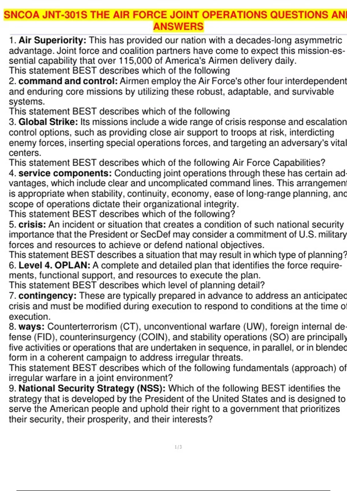 1 / 3 SNCOA JNT-301S THE AIR FORCE JOINT OPERATIONS QUESTIONS AND ANSWERS 1. Air Superiority: This has provided our nation with a decades-long asymmetric advantage. Joint force and coalition partners have come to expect this mission-es- sential capability that over 115,000 of America's Airmen delivery daily. This statement BEST describes which of the following 2. command and control: Airmen employ the Air Force's other four interdependent and enduring core missions by utilizing these robust, adaptable, and survivable systems. This statement B