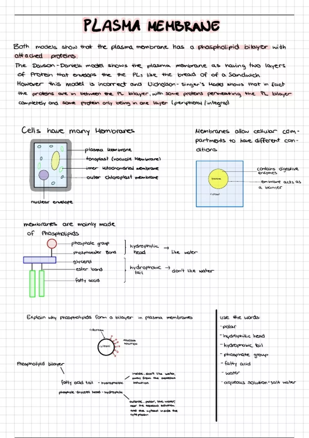Comprehensive notes on the structure and function of the plasma membrane, written in English – ideal for IB or bilingual biology classes. Topics include: • Phospholipid bilayer • Fluid mosaic model • Transport mechanisms (diffusion, osmosis, active transport) • Protein channels, aquaporins • Illustrated explanations Format: 3 pages