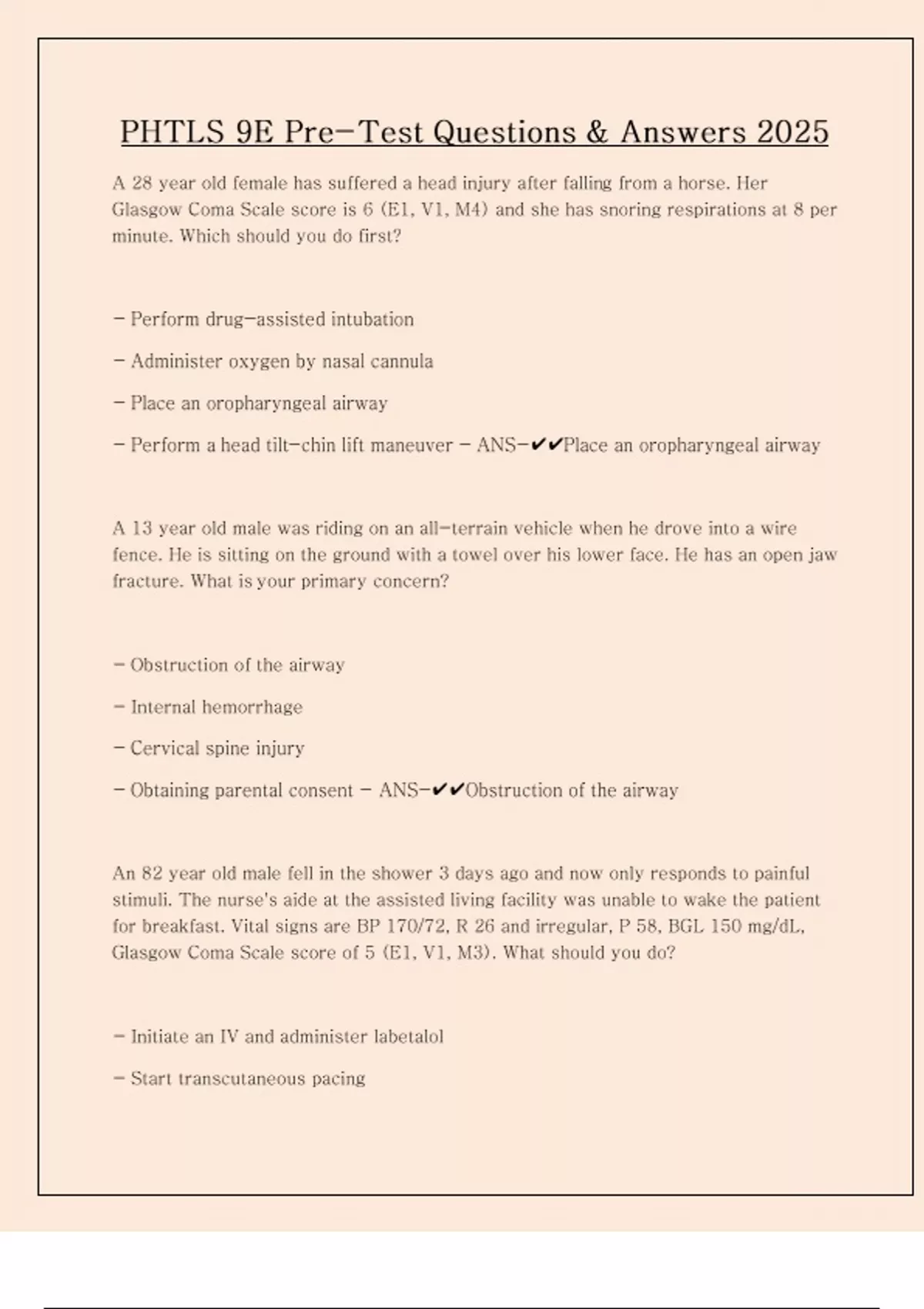PHTLS 9E Pre-Test Questions & Answers 2025 A 28 year old female has suffered a head injury after falling from a horse. Her Glasgow Coma Scale score is 6 (E1, V1, M4) and she has snoring respirations at 8 per minute. Which should you do first? - Perform drug-assisted intubation - Administer oxygen by nasal cannula - Place an oropharyngeal airway - Perform a head tilt-chin lift maneuver - ANS-Place an oropharyngeal airway A 13 year old male was riding on an all-terrain vehicle when he drove into a wire fence. He is sitting on the ground with a towel over his lower face. He has an open jaw fracture. What is your primary concern? - Obstruction of the airway - Internal hemorrhage - Cervical spine injury - Obtaining parental consent - ANS-Obstruction of the airway An 82 year old male fell in the shower 3 days ago and now only responds to painful stimuli. The nurse's aide at the assisted living facility was unable to wake the patient for breakfast. Vital signs are BP 170/72, R 26 and irregular, P 58, BGL 150 mg/dL, Glasgow Coma Scale score of 5 (E1, V1, M3). What should you do? - Initiate an IV and administer labetalol - Start transcutaneous pacing