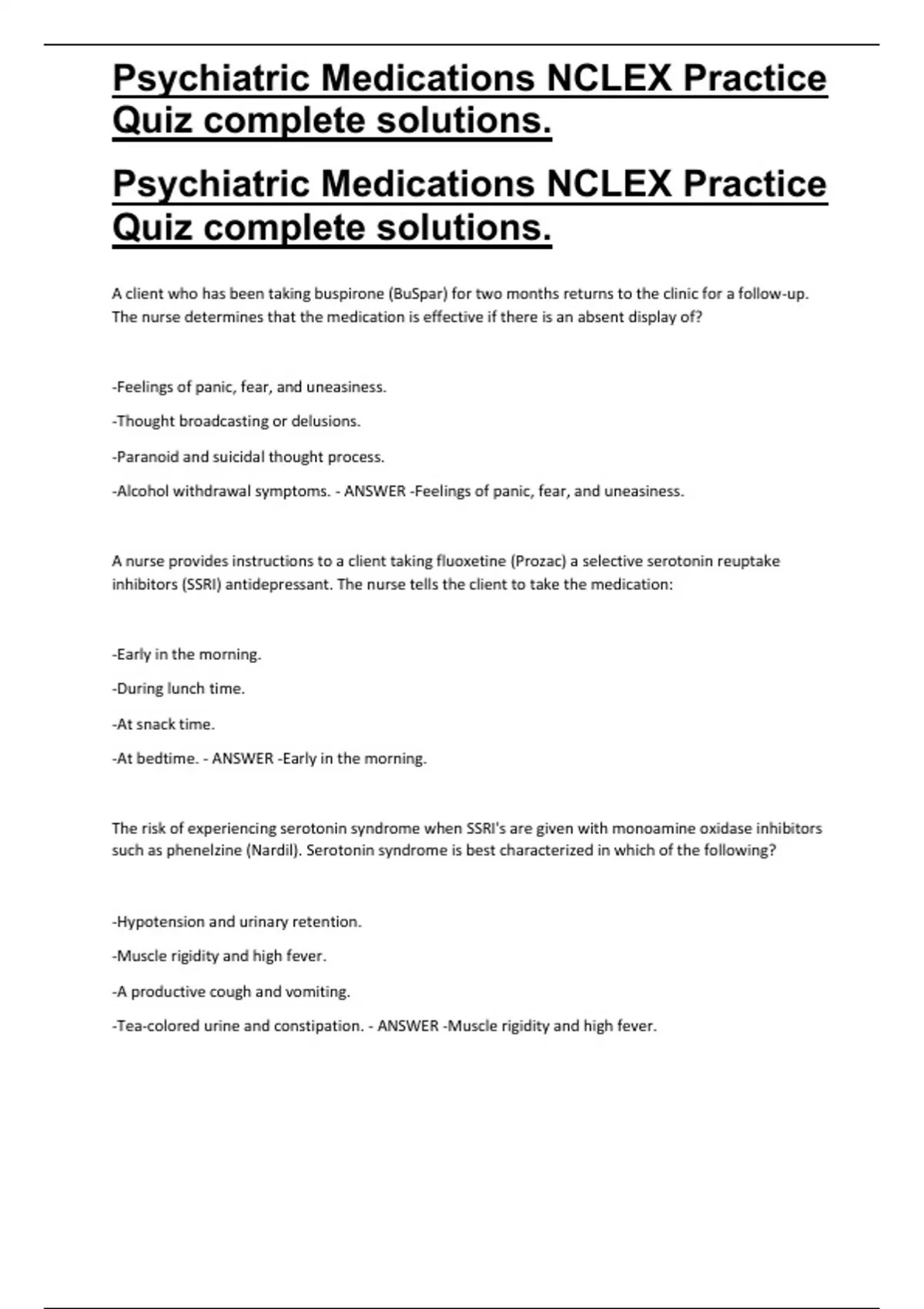 Psychiatric Medications NCLEX Practice