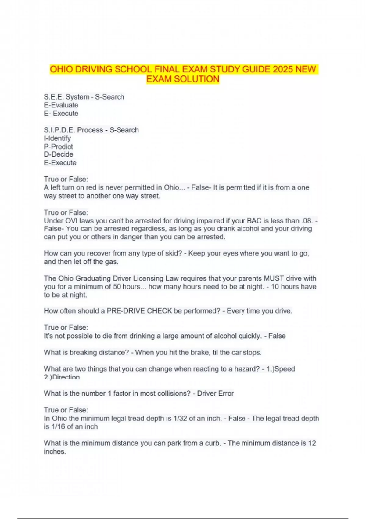 OHIO DRIVING SCHOOL FINAL EXAM STUDY GUIDE 2025 NEW EXAM SOLUTION