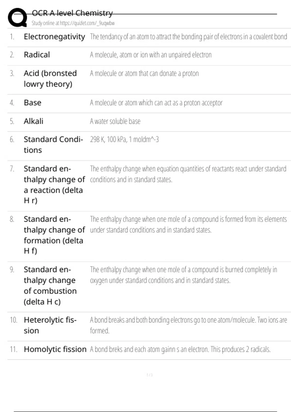 9. Standard en- The enthalpy change when one mole of a compound is burned completely in