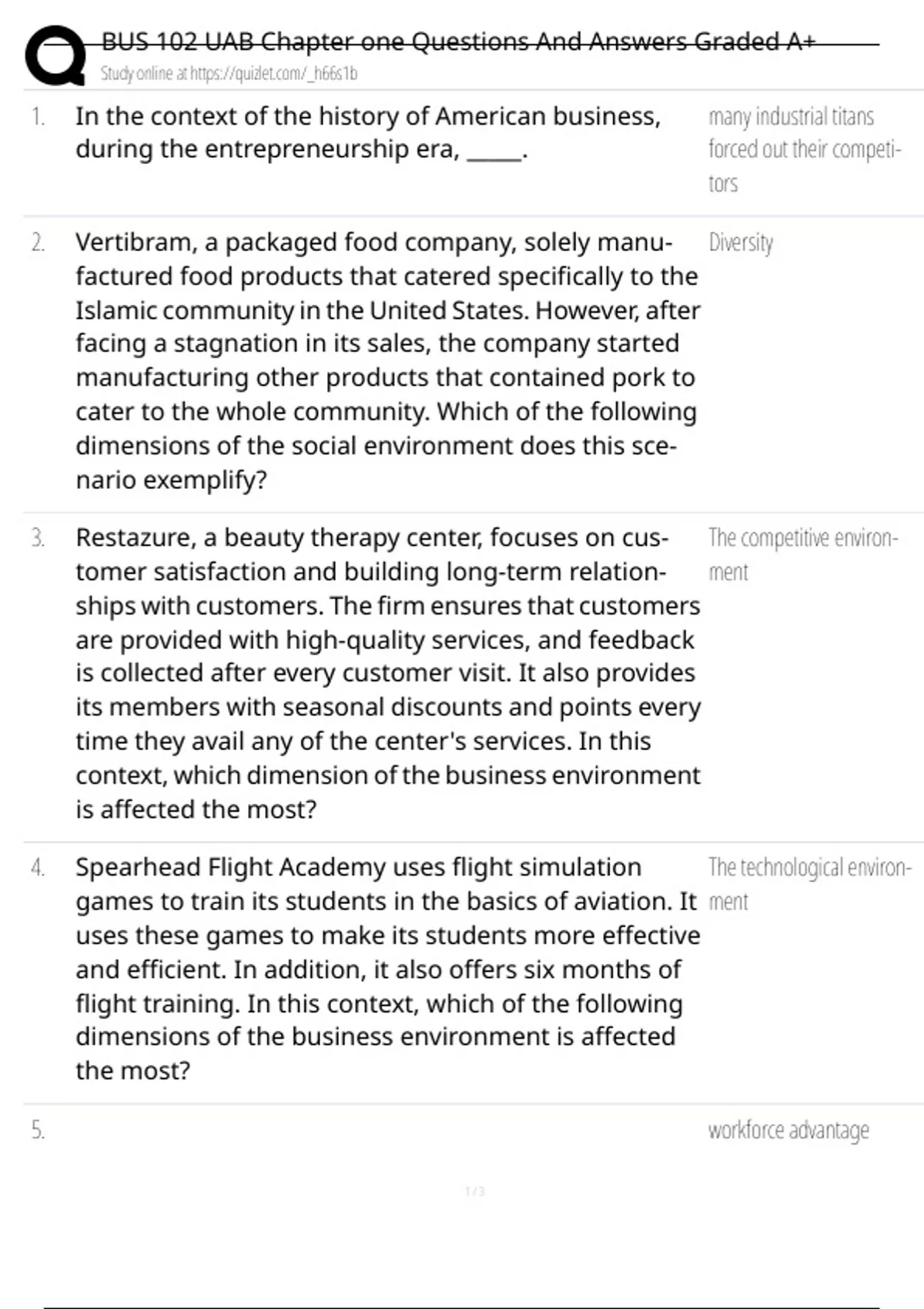 BUS 102 UAB Chapter one Questions And Answers Graded A+