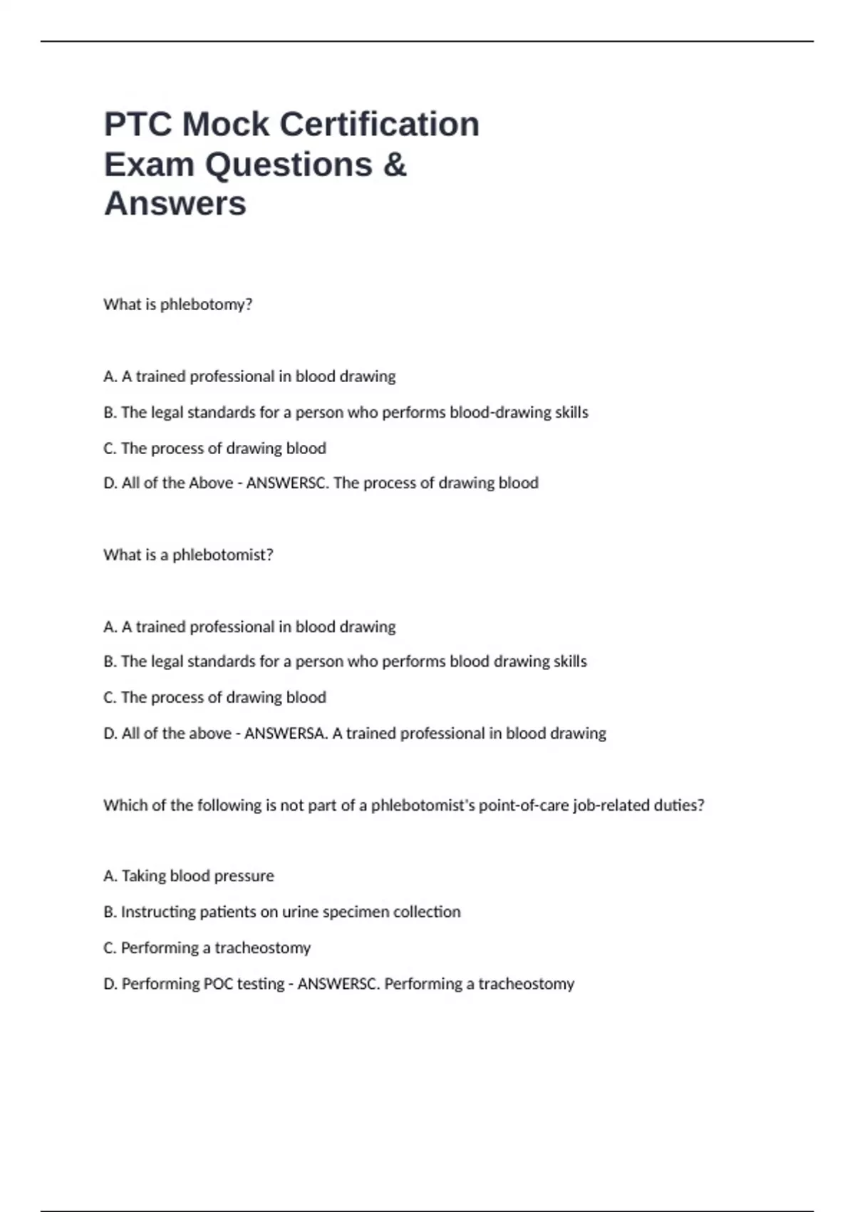 PTC Mock Certification Exam Questions & Answers What is phlebotomy? A. A trained professional in blood drawing B. The legal standards for a person who performs blood-drawing skills C. The process of drawing blood D. All of the Above - ANSWERSC. The process of drawing blood What is a phlebotomist? A. A trained professional in blood drawing B. The legal standards for a person who performs blood drawing skills C. The process of drawing blood D. All of the above - ANSWERSA. A trained professional in blood drawing Which of the following is not part of a phlebotomist's point-of-care job-related duties? A. Taking blood pressure B. Instructing patients on urine specimen collection C. Performing a tracheostomy D. Performing POC testing - ANSWERSC. Performing a tracheostomy