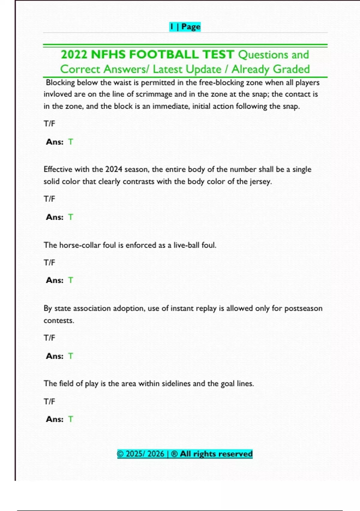 This document provides the complete set of graded true/false and multiple-choice questions from the 2022 NFHS Football Rules Test, including the official correct answers. It covers key rule changes and updates relevant through the 2025/2026 seasons, such as blocking rules, penalties, fair-catch interpretations, and game administration protocols. Ideal for students, referees, or coaches preparing for certification or in-season officiating assessments.