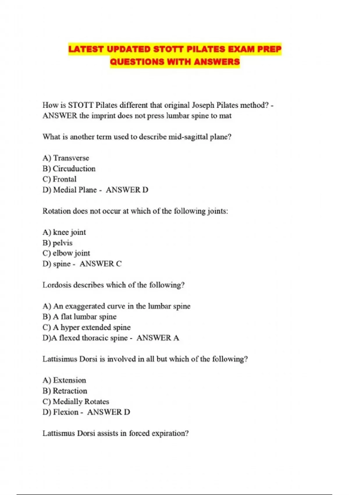 LATEST UPDATED STOTT PILATES EXAM PREP QUESTIONS WITH ANSWERS...