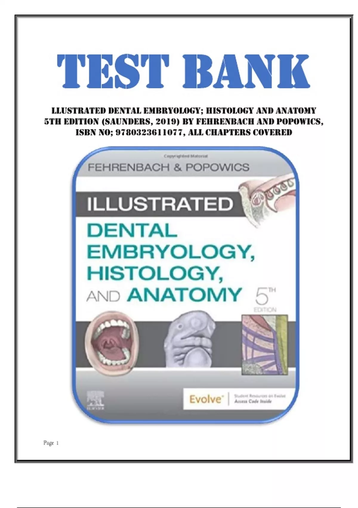 Test Bank for llustrated Dental Embryology; Histology and Anatomy 5th Edition (Saunders, 2019) by Fehrenbach and Popowics, Isbn no; 9780323611077, all Chapters Covered