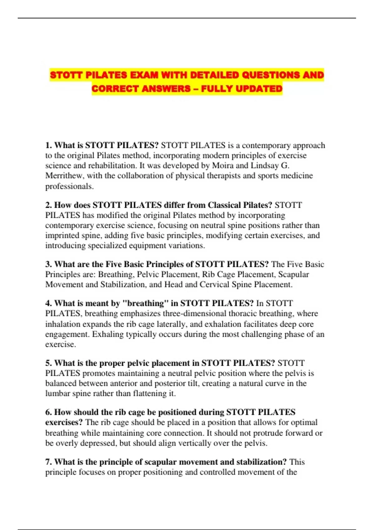 STOTT PILATES EXAM WITH DETAILED QUESTIONS AND