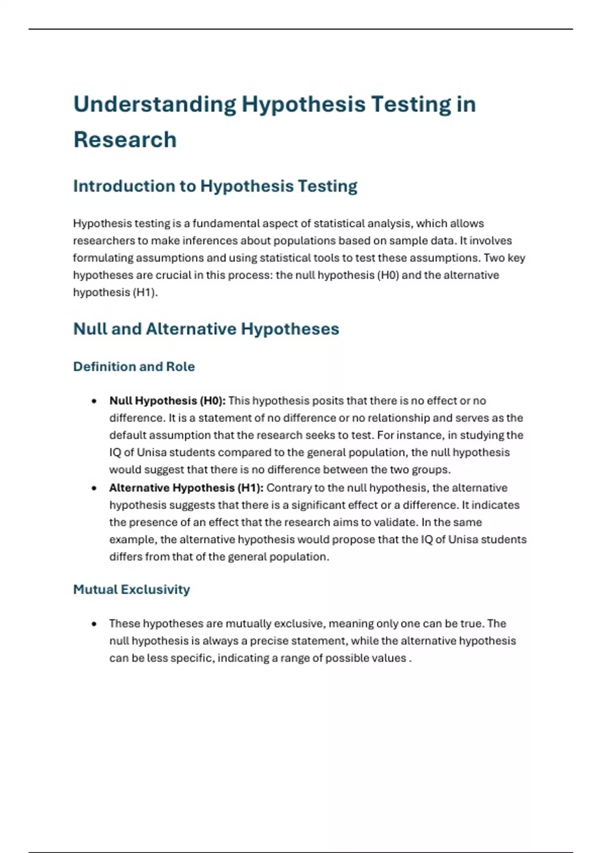 This instructional document explores the core concepts and procedures of hypothesis testing, a statistical method used to make decisions about population parameters based on sample data. It opens with an introduction to hypothesis testing, highlighting its role in validating research assumptions. The document then explains the two foundational hypotheses—the null hypothesis (H₀), which assumes no effect or difference, and the alternative hypothesis (H₁), which posits a significant effect. It distinguishes between directional and non-directional hypotheses, providing real-world examples for clarity. A step-by-step breakdown of the hypothesis testing process is presented, from formulating hypotheses to making decisions based on statistical tests. The use of z-tests and t-tests is explained with formulas, alongside the critical value and p-value approaches to decision-making. The document also covers common statistical errors, such as Type I and Type II errors, and emphasizes the importance of sample size in enhancing the reliability and power of a test. To ground theory in practice, a case study is included involving an AIDS awareness workshop, illustrating how hypothesis testing is used to evaluate program effectiveness through statistical evidence. The document concludes by reinforcing the value of hypothesis testing in research, emphasizing that a solid understanding of these principles is vital for drawing valid, data-driven conclusions.