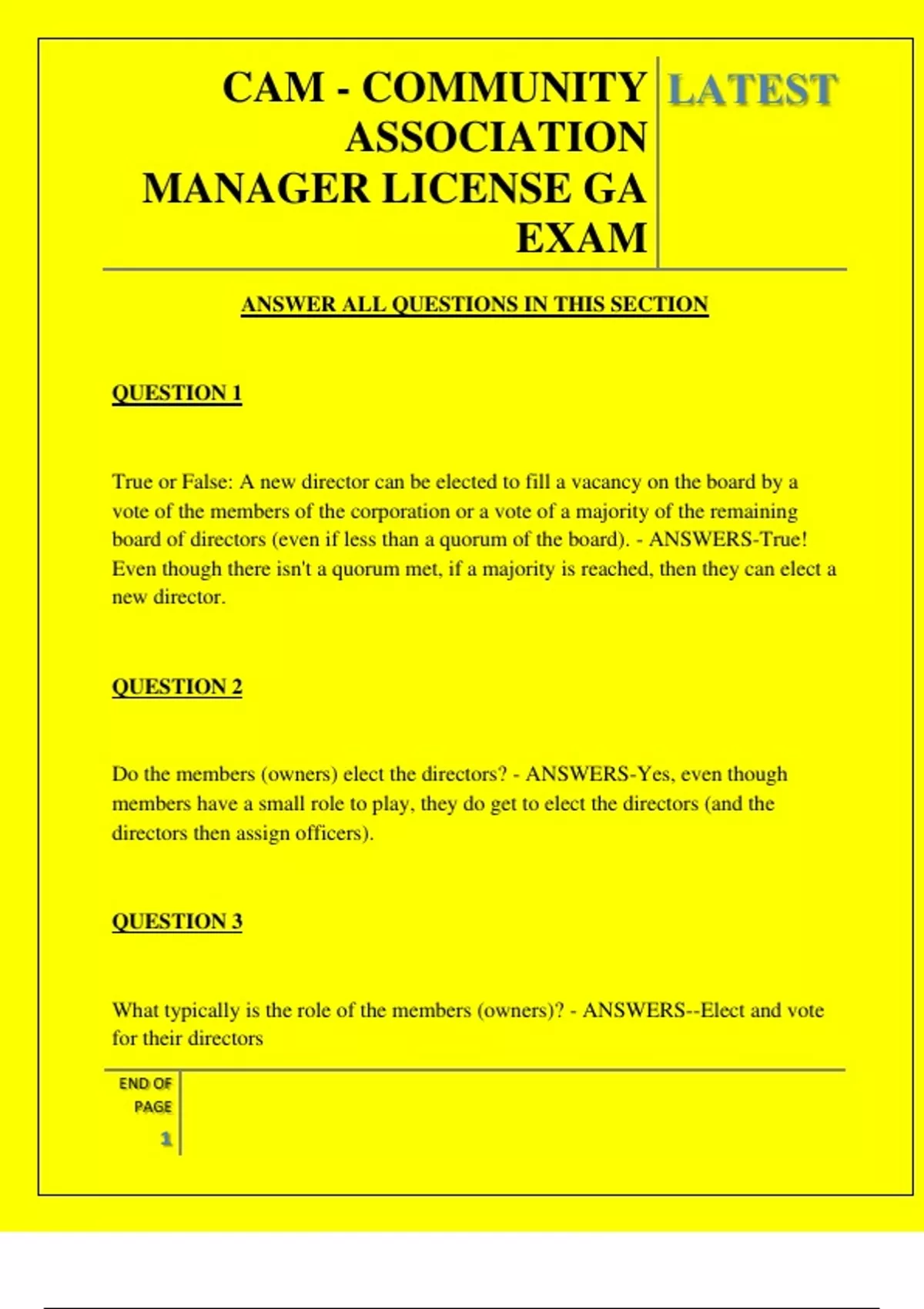 CAM - COMMUNITY ASSOCIATION MANAGER LICENSE GA EXAM QUESTIONS AND ANSWERS 2025