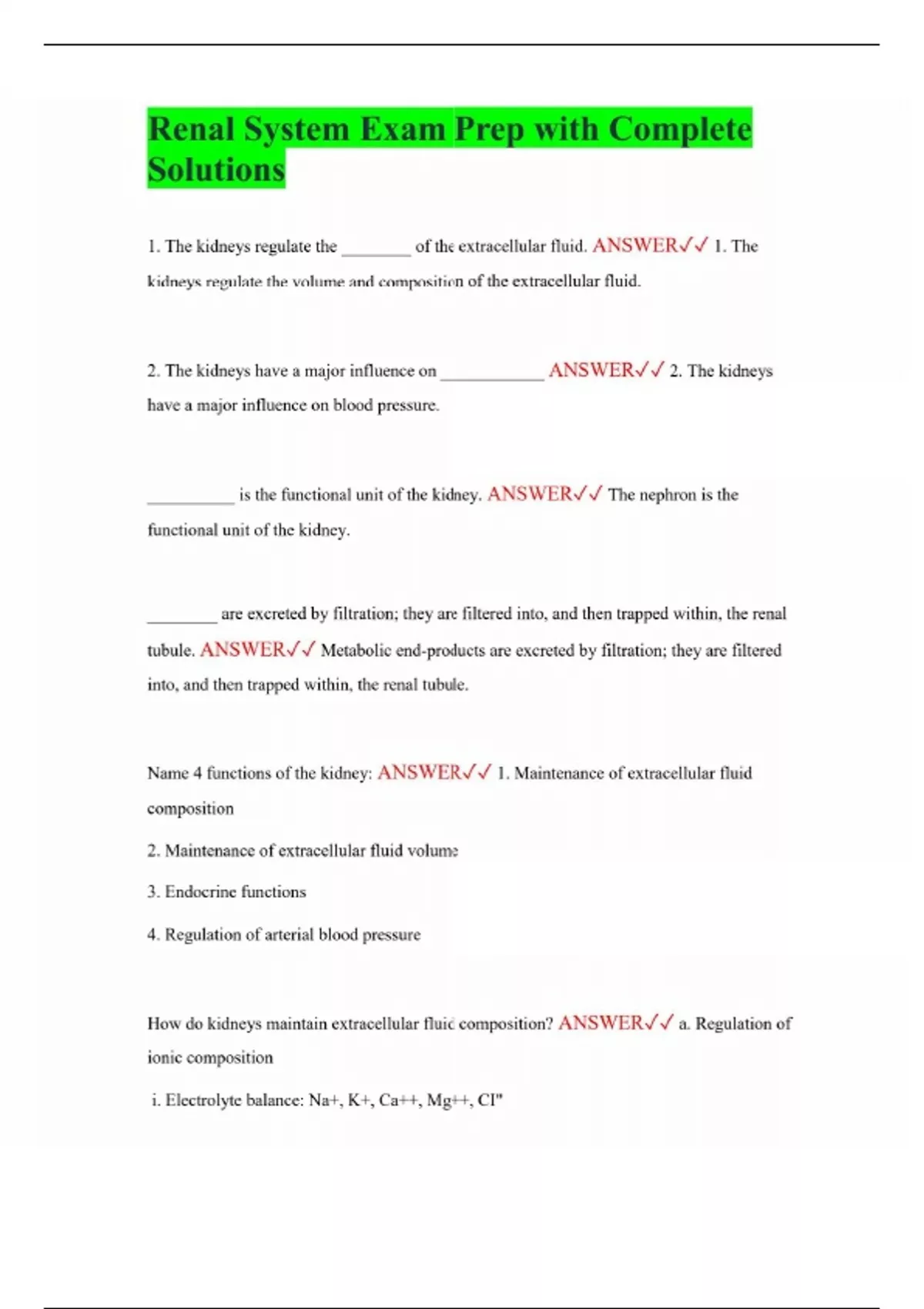 Renal System Exam Prep with Complete Solutions 1. The kidneys regulate the ________ of the extracellular fluid. ANSWER 1. The kidneys regulate the volume and composition of the extracellular fluid. 2. The kidneys have a major influence on ____________ ANSWER 2. The kidneys have a major influence on blood pressure. __________ is the functional unit of the kidney. ANSWER The nephron is the functional unit of the kidney. ________ are excreted by filtration; they are filtered into, and then trapped within, the renal tubule. ANSWER Metabolic end-products are excreted by filtration; they are filtered into, and then trapped within, the renal tubule. Name 4 functions of the kidney: ANSWER 1. Maintenance of extracellular fluid composition 2. Maintenance of extracellular fluid volume 3. Endocrine functions 4. Regulation of arterial blood pressure How do kidneys maintain extracellular fluid composition? ANSWER a. Regulation of ionic composition i. Electrolyte balance: Na+, K+, Ca++, Mg++, CI"