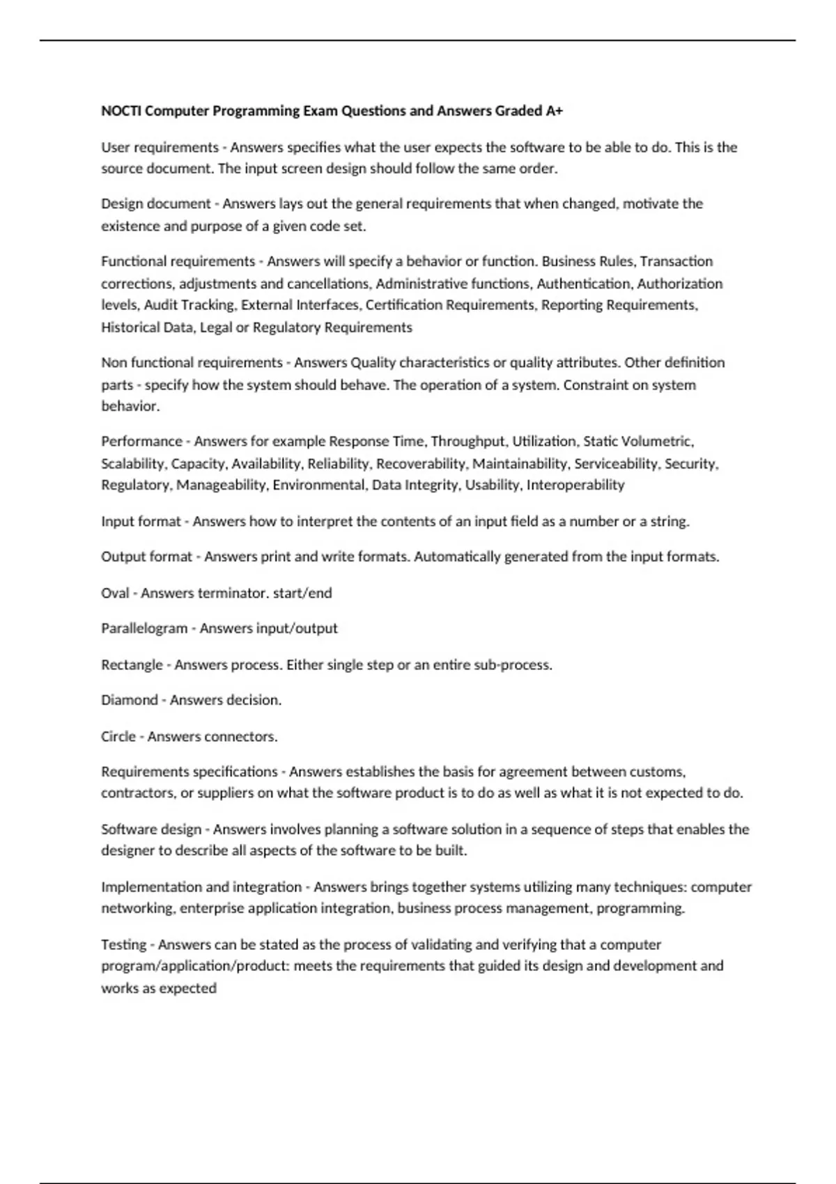 NOCTI Computer Programming Exam Questions and Answers Graded A+ User requirements - Answers specifies what the user expects the software to be able to do. This is the source document. The input screen design should follow the same order. Design document - Answers lays out the general requirements that when changed, motivate the existence and purpose of a given code set. Functional requirements - Answers will specify a behavior or function. Business Rules, Transaction corrections, adjustments and cancellations, Administrative functions, Authentication, Authorization levels, Audit Tracking, External Interfaces, Certification Requirements, Reporting Requirements, Historical Data, Legal or Regulatory Requirements Non functional requirements - Answers Quality characteristics or quality attributes. Other definition parts - specify how the system should behave. The operation of a system. Constraint on system behavior. Performance - Answers for example Response Time, Throughput, Utilization, Static Volumetric, Scalability, Capacity, Availability, Reliability, Recoverability, Maintainability, Serviceability, Security, Regulatory, Manageability, Environmental, Data Integrity, Usability, Interoperability Input format - Answers how to interpret the contents of an input field as a number or a string. Output format - Answers print and write formats. Automatically generated from the input formats. Oval - Answers terminator. start/end Parallelogram - Answers input/output Rectangle - Answers process. Either single step or an entire sub-process. Diamond - Answers decision. Circle - Answers connectors. Requirements specifications - Answers establishes the basis for agreement between customs, contractors, or suppliers on what the software product is to do as well as what it is not expected to do. Software design - Answers involves planning a software solution in a sequence of steps that enables the designer to describe all aspects of the software to be built. Implementation and integration - Answers brings together systems utilizing many techniques: computer networking, enterprise application integration, business process management, programming. Testing - Answers can be stated as the process of validating and verifying that a computer program/application/product: meets the requirements that guided its design and development and works as expected Deployment - Answers is all of the following activities that make a software system available for use: Release, Install and Activate, Deactivate, Adapt, Update, Built-in, Version Tracking, Uninstall, Retire Maintenance - Answers the modification of a software product after delivery to correct faults, to improve performance or other attributes. Design Program Solutions - Answers Primary storage - Answers RAM. Stack - Answers Heap - Answers Distributed computing - Answers a field of computer science that studies distributed systems. A distributed system is a model in which components located on networked computers communicate and coordinate their actions by passing messages. The components interact with each other in order to achieve a common goal. Data Storage Field length - Answers the amount of characters the field can hold. Data Storage Record length - Answers the length, in bytes, of each record in the data set. Of all the fields. Data formats Delimited - Answers a character is used to separate the values (comma, tab, colon).