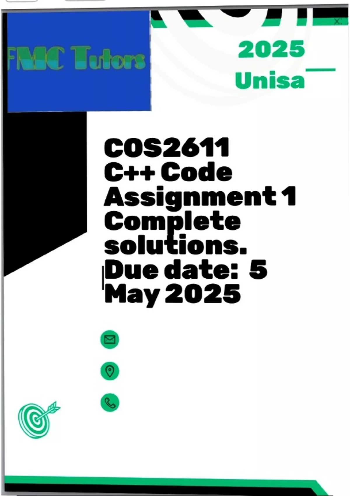 Cos 2611 assignment 1 completed detailed solutions Unisa. A excellent coding solution document in C ++ with a example given in the code showed with the output and completed comments with the code . Page 2-3,4-5,6-7 goes together. Please remember to change the pathway in your code from my test one to Windows: C:datataxiD. So it can run through your data set . A explanation is also given of all the structures used . Great marks guaranteed .