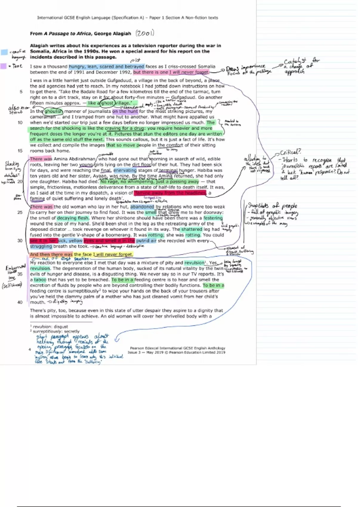 For Pearson Edexcel IGCSE English Language (specification A). From: Part 1: Paper 1 Section A Non-fiction texts. A passage to Africa by George Alagiah (2001) annotated text. (If any of the annotations are illegible/too small to read, message me and I'll send a close-up or tell you what I meant to write)