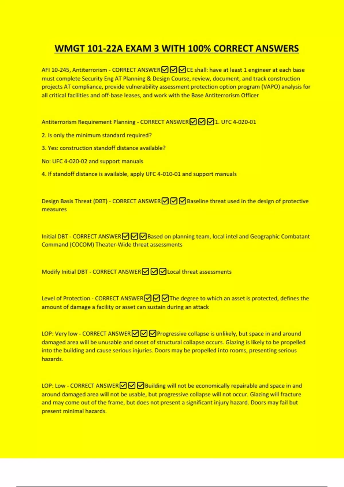 WMGT 101-22A EXAM 3 WITH 100% CORRECT ANSWERS AFI 10-245, Antiterrorism - CORRECT ANSWERCE shall: have at least 1 engineer at each base must complete Security Eng AT Planning & Design Course, review, document, and track construction projects AT compliance, provide vulnerability assessment protection option program (VAPO) analysis for all critical facilities and off-base leases, and work with the Base Antiterrorism Officer