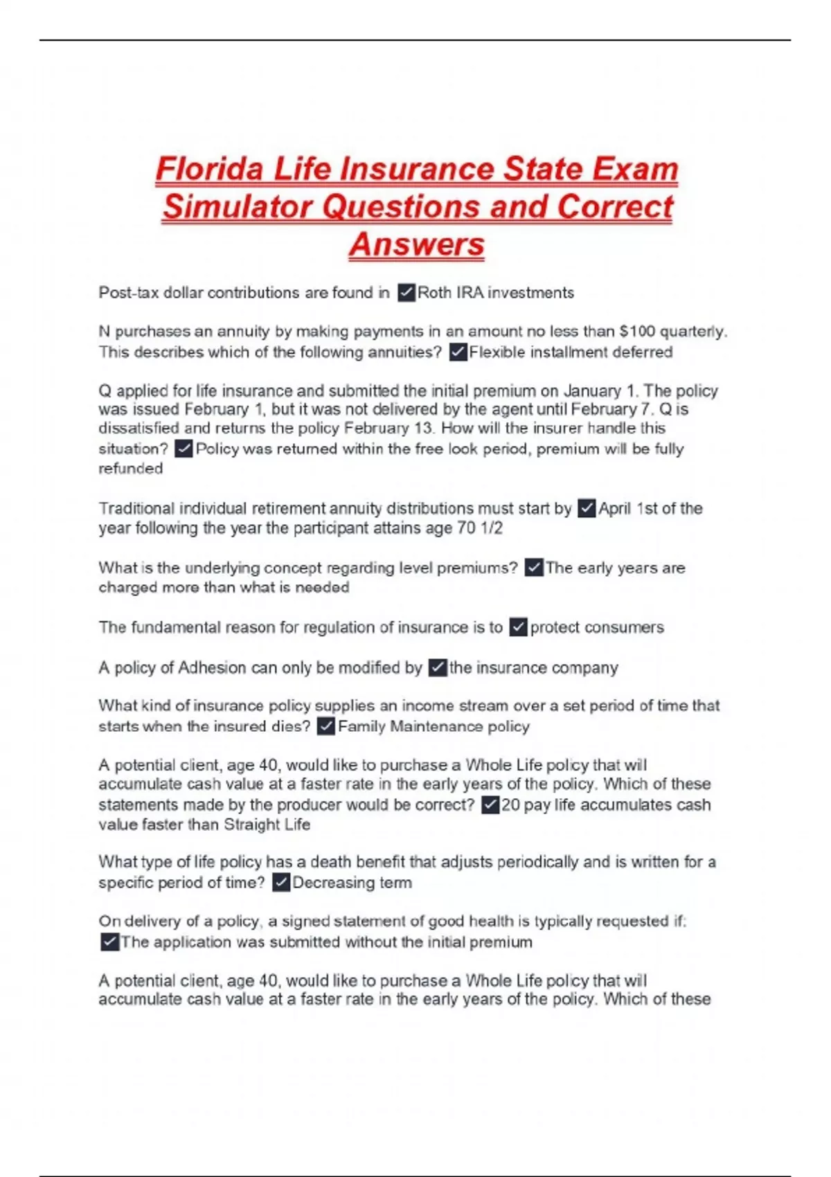Florida Life Insurance State Exam Simulator Questions and Correct Answers Post-tax dollar contributions are found in Roth IRA investments N purchases an annuity by making payments in an amount no less than $100 quarterly. This describes which of the following annuities? Flexible installment deferred Q applied for life insurance and submitted the initial premium on January 1. The policy was issued February 1, but it was not delivered by the agent until February 7. Q is dissatisfied and returns the policy February 13. How will the insurer handle this situation? Policy was returned within the free look period, premium will be fully refunded Traditional individual retirement annuity distributions must start by April 1st of the year following the year the participant attains age 70 1/2 What is the underlying concept regarding level premiums? The early years are charged more than what is needed The fundamental reason for regulation of insurance is to protect consumers A policy of Adhesion can only be modified by the insurance company