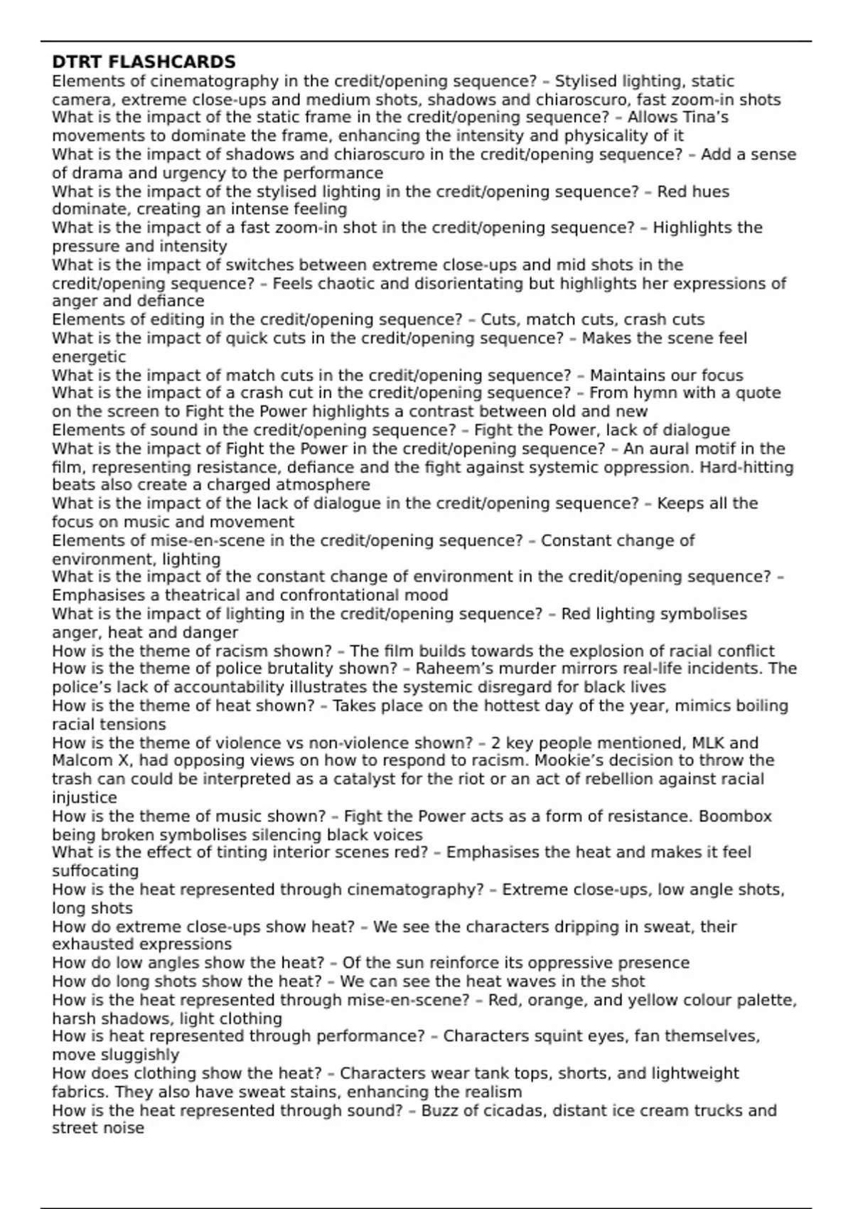 This is a useful Do The Right Thing sheet of pre-made flashcards about techniques used in the film. Information about micro elements and key scenes to help you make quizlet sets, physical flashcards etc