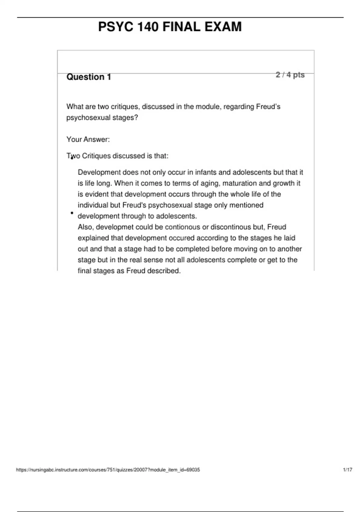 Portage Learning PSYC 140 FINAL EXAM LATEST QUESTIONS AND ANSWERS. PSYC 140 FINAL EXAM Question 1 2 / 4 pts What are two critiques, discussed in the module, regarding Freud’s psychosexual stages? Your Answer: Two Critiques discussed is that: Development does not only occur in infants and adolescents but that it is life long. When it comes to terms of aging, maturation and growth it is evident that development occurs through the whole life of the individual but Freud's psychosexual stage only mentioned development through to adolescents. Also, developmet could be contionous or discontinous but, Freud explained that development occured according to the stages he laid out and that a stage had to be completed before moving on to another stage but in the real sense not all adolescents complete or get to the final stages as Freud described. phallic Your Answer: Phallic stage Ages 3-6: For each of the age groups listed below, list the psychosexual stage described by Freud. Question 2 1 / 1 pts The phallic stage of psychosexual development ends at age . Your Answer: 6 Question 3 1 / 1 pts Answers need to discuss the lack of a lifespan approach and a methodology that only relies on a clinical sample. Correct! False True ,