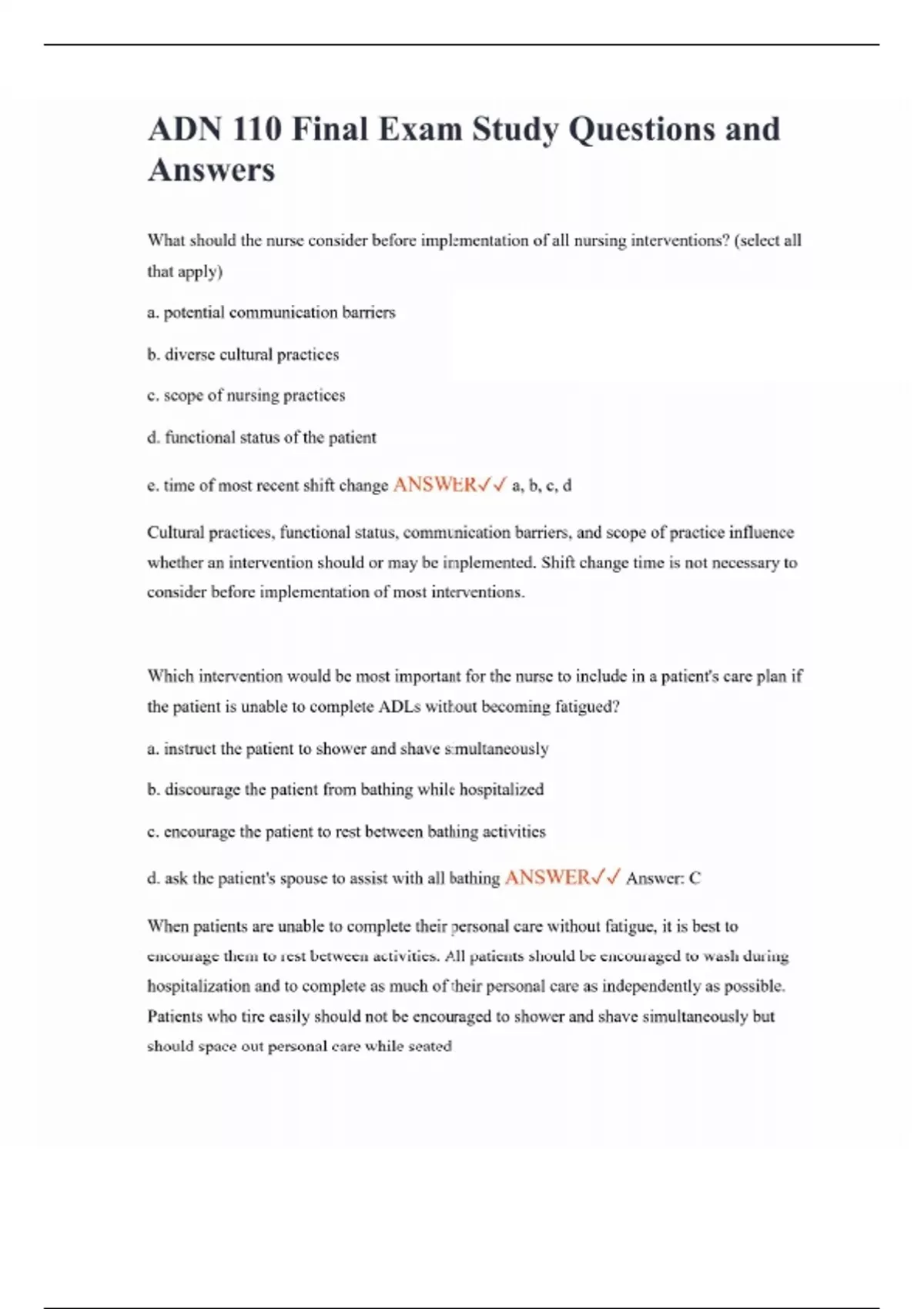 ADN 110 Final Exam Study Questions and Answers What should the nurse consider before implementation of all nursing interventions? (select all that apply) a. potential communication barriers b. diverse cultural practices c. scope of nursing practices d. functional status of the patient e. time of most recent shift change ANSWER a, b, c, d Cultural practices, functional status, communication barriers, and scope of practice influence whether an intervention should or may be implemented. Shift change time is not necessary to consider before implementation of most interventions. Which intervention would be most important for the nurse to include in a patient's care plan if the patient is unable to complete ADLs without becoming fatigued? a. instruct the patient to shower and shave simultaneously b. discourage the patient from bathing while hospitalized c. encourage the patient to rest between bathing activities d. ask the patient's spouse to assist with all bathing ANSWER Answer: C When patients are unable to complete their personal care without fatigue, it is best to encourage them to rest between activities. All patients should be encouraged to wash during hospitalization and to complete as much of their personal care as independently as possible. Patients who tire easily should not be encouraged to shower and shave simultaneously but should space out personal care while seated.
