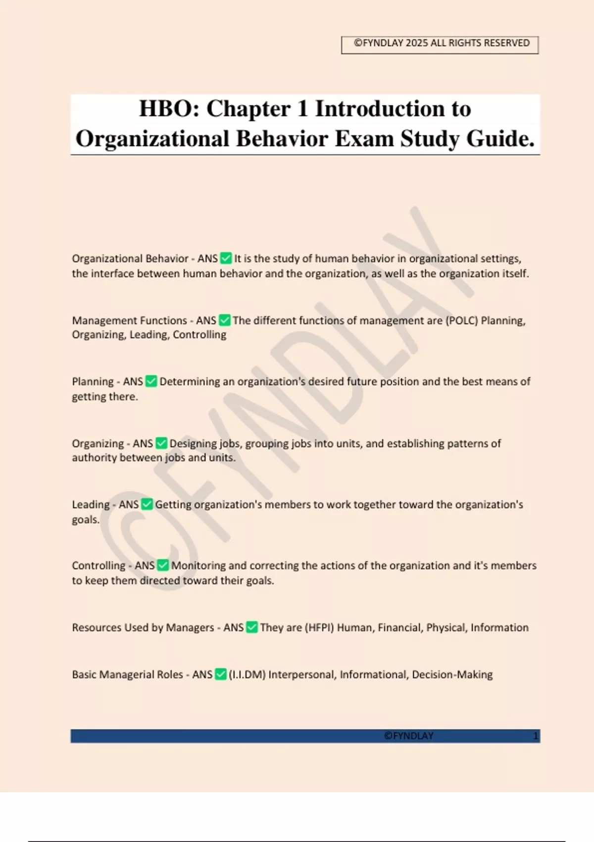 HBO: Chapter 1 Introduction to Organizational Behavior Exam Study Guide. Organizational Behavior - ANS It is the study of human behavior in organizational settings, the interface between human behavior and the organization, as well as the organization itself. Management Functions - ANS The different functions of management are (POLC) Planning, Organizing, Leading, Controlling Planning - ANS Determining an organization's desired future position and the best means of getting there. Organizing - ANS Designing jobs, grouping jobs into units, and establishing patterns of authority between jobs and units. Leading - ANS Getting organization's members to work together toward the organization's goals. Controlling - ANS Monitoring and correcting the actions of the organization and it's members to keep them directed toward their goals. Resources Used by Managers - ANS They are (HFPI) Human, Financial, Physical, Information Basic Managerial Roles - ANS (I.I.DM) Interpersonal, Informational, Decision-Making