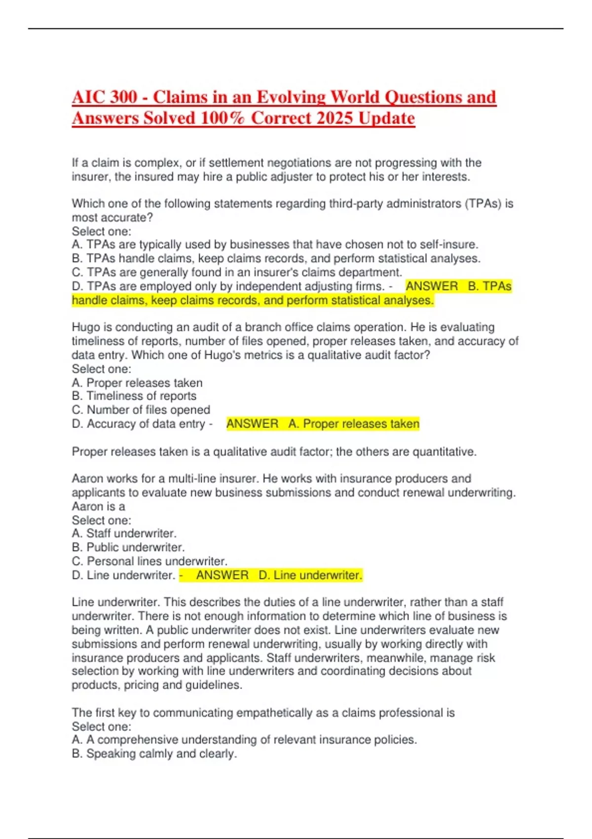 If a claim is complex, or if settlement negotiations are not progressing with the insurer, the insured may hire a public adjuster to protect his or her interests. Which one of the following statements regarding third-party administrators (TPAs) is most accurate? Select one: A. TPAs are typically used by businesses that have chosen not to self-insure. B. TPAs handle claims, keep claims records, and perform statistical analyses. C. TPAs are generally found in an insurer's claims department. D. TPAs are employed only by independent adjusting firms. - ANSWER B. TPAs handle claims, keep claims records, and perform statistical analyses. Hugo is conducting an audit of a branch office claims operation. He is evaluating timeliness of reports, number of files opened, proper releases taken, and accuracy of data entry. Which one of Hugo's metrics is a qualitative audit factor? Select one: A. Proper releases taken B. Timeliness of reports C. Number of files opened D. Accuracy of data entry - ANSWER A. Proper releases taken Proper releases taken is a qualitative audit factor; the others are quantitative. Aaron works for a multi-line insurer. He works with insurance producers and applicants to evaluate new business submissions and conduct renewal underwriting. Aaron is a Select one: A. Staff underwriter. B. Public underwriter. C. Personal lines underwriter. D. Line underwriter. - ANSWER D. Line underwriter