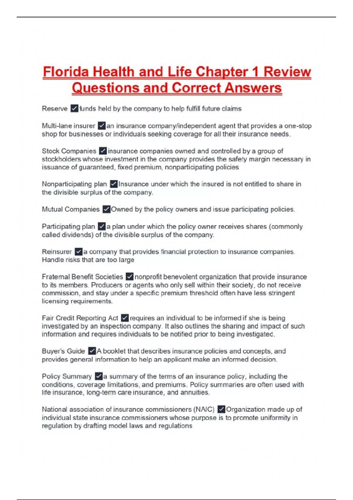 Florida Health and Life Chapter 1 Review Questions and Correct Answers Reserve funds held by the company to help fulfill future claims Multi-lane insurer an insurance company/independent agent that provides a one-stop shop for businesses or individuals seeking coverage for all their insurance needs. Stock Companies insurance companies owned and controlled by a group of stockholders whose investment in the company provides the safety margin necessary in issuance of guaranteed, fixed premium, nonparticipating policies Nonparticipating plan Insurance under which the insured is not entitled to share in the divisible surplus of the company. Mutual Companies Owned by the policy owners and issue participating policies. Participating plan a plan under which the policy owner receives shares (commonly called dividends) of the divisible surplus of the company. Reinsurer a company that provides financial protection to insurance companies. Handle risks that are too large Fraternal Benefit Societies nonprofit benevolent organization that provide insurance to its members. Producers or agents who only sell within their society, do not receive commission, and stay under a specific premium threshold often have less stringent licensing requirements. Fair Credit Reporting Act requires an individual to be informed if she is being investigated by an inspection company. It also outlines the sharing and impact of such information and requires individuals to be notified prior to being investigated. Buyer's Guide A booklet that describes insurance policies and concepts, and provides general information to help an applicant make an informed decision. Policy Summary a summary of the terms of an insurance policy, including the conditions, coverage limitations, and premiums. Policy summaries are often used with life insurance, long-term care insurance, and annuities. National association of insurance commissioners (NAIC) Organization made up of individual state insurance commissioners whose purpose is to promote uniformity in regulation by drafting model laws and regulations