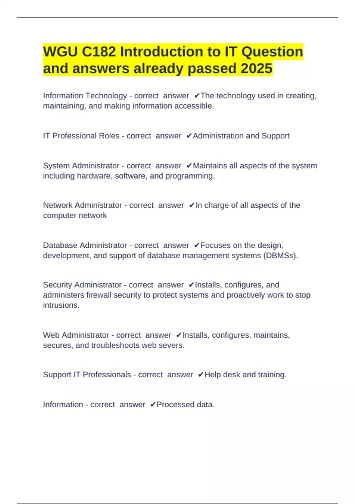 WGU C182 Introduction to IT Question and answers already passed 2025 Information Technology - correct answer The technology used in creating, maintaining, and making information accessible. IT Professional Roles - correct answer Administration and Support System Administrator - correct answer Maintains all aspects of the system including hardware, software, and programming. Network Administrator - correct answer In charge of all aspects of the computer network Database Administrator - correct answer Focuses on the design, development, and support of database management systems (DBMSs). Security Administrator - correct answer Installs, configures, and administers firewall security to protect systems and proactively work to stop intrusions. Web Administrator - correct answer Installs, configures, maintains, secures, and