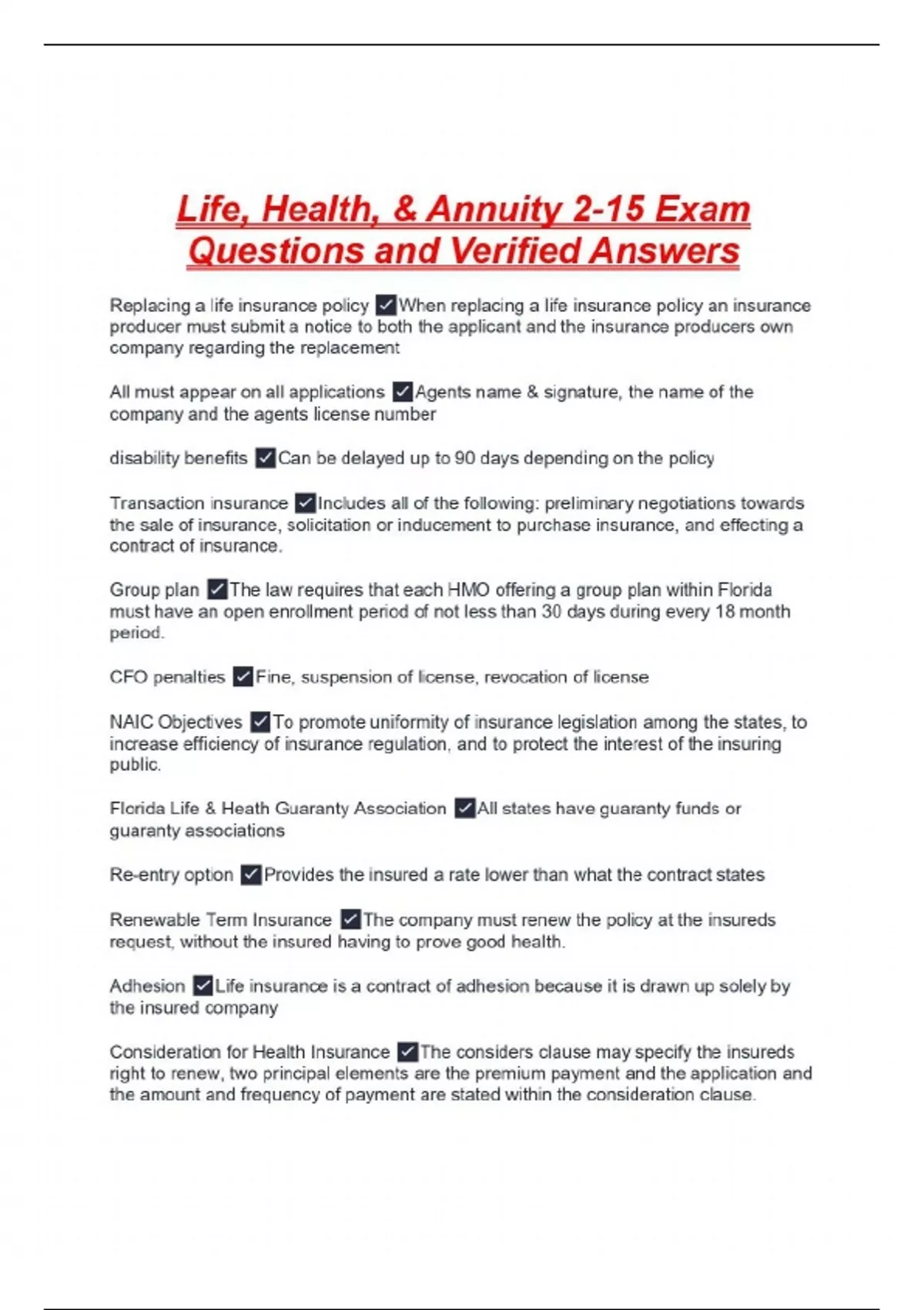 Life, Health, & Annuity 2-15 Exam Questions and Verified Answers Replacing a life insurance policy When replacing a life insurance policy an insurance producer must submit a notice to both the applicant and the insurance producers own company regarding the replacement All must appear on all applications Agents name & signature, the name of the company and the agents license number disability benefits Can be delayed up to 90 days depending on the policy Transaction insurance Includes all of the following: preliminary negotiations towards the sale of insurance, solicitation or inducement to purchase insurance, and effecting a contract of insurance. Group plan The law requires that each HMO offering a group plan within Florida must have an open enrollment period of not less than 30 days during every 18 month period. CFO penalties Fine, suspension of license, revocation of license NAIC Objectives To promote uniformity of insurance legislation among the states, to increase efficiency of insurance regulation, and to protect the interest of the insuring public. Florida Life & Heath Guaranty Association All states have guaranty funds or guaranty associations Re-entry option Provides the insured a rate lower than what the contract states Renewable Term Insurance The company must renew the policy at the insureds request, without the insured having to prove good health. Adhesion Life insurance is a contract of adhesion because it is drawn up solely by the insured company Consideration for Health Insurance The considers clause may specify the insureds right to renew, two principal elements are the premium payment and the application and the amount and frequency of payment are stated within the consideration clause. Twisting and rebating Apply to both life and health insurance Term Is the most commonly used for group life insurance Health insurance companies Are not voluntary service organizations A multiple protection policy Pays a benefit of double or triple the face amount if death occurs during a specific period Typical health insurance Covers most things except expenses associated with treatment of injury or sickness Emergency period Is not recognized as an income need period for survivors in life insurance planning Coinsurance The insured bears a percentage of the cost of health care services being received.