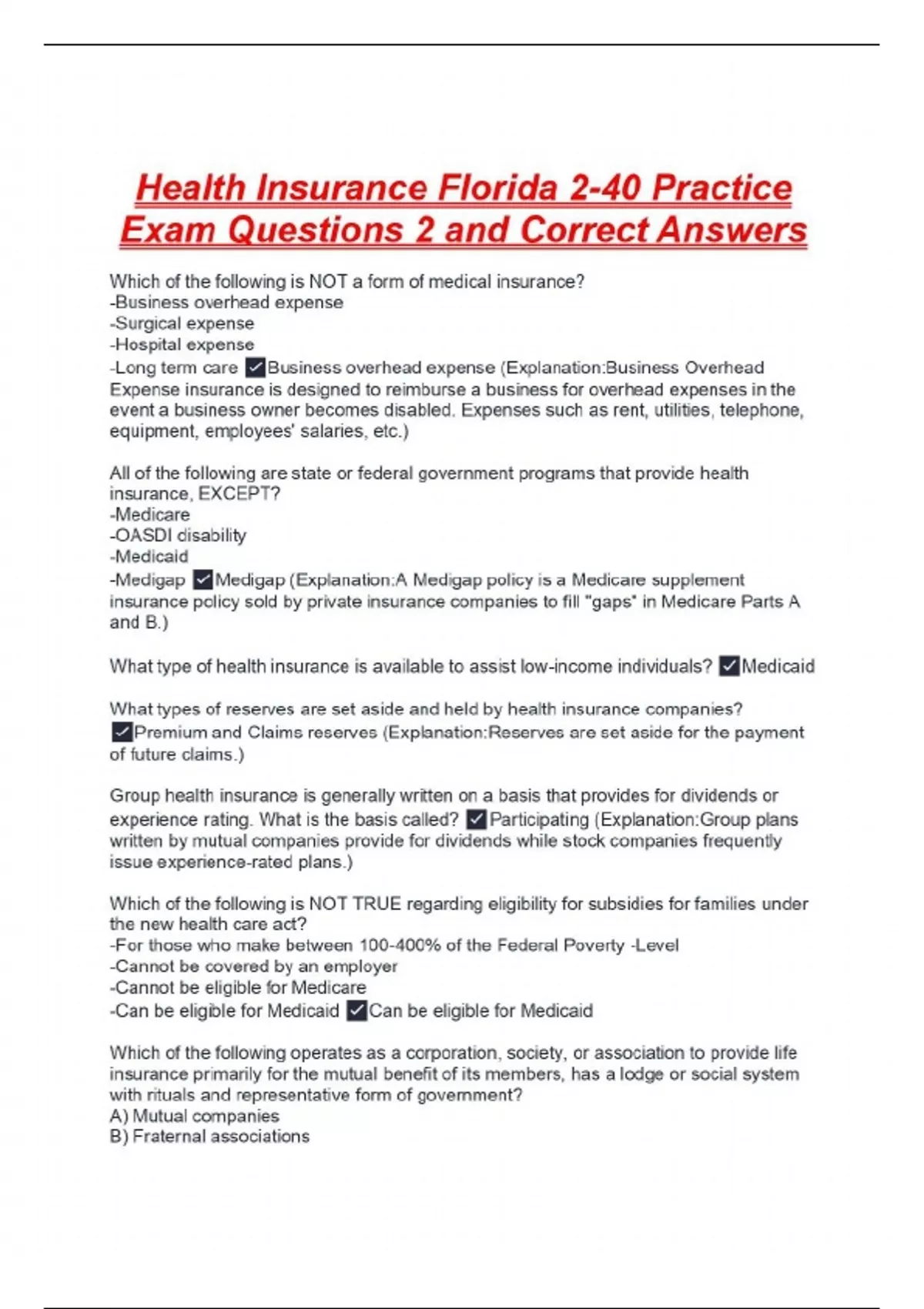 Health Insurance Florida 2-40 Practice Exam Questions 2 and Correct Answers Which of the following is NOT a form of medical insurance? -Business overhead expense -Surgical expense -Hospital expense -Long term care Business overhead expense (Explanation:Business Overhead Expense insurance is designed to reimburse a business for overhead expenses in the event a business owner becomes disabled. Expenses such as rent, utilities, telephone, equipment, employees' salaries, etc.) All of the following are state or federal government programs that provide health insurance, EXCEPT? -Medicare -OASDI disability -Medicaid -Medigap Medigap (Explanation:A Medigap policy is a Medicare supplement insurance policy sold by private insurance companies to fill "gaps" in Medicare Parts A and B.) What type of health insurance is available to assist low-income individuals? Medicaid What types of reserves are set aside and held by health insurance companies? Premium and Claims reserves (Explanation:Reserves are set aside for the payment of future claims.) Group health insurance is generally written on a basis that provides for dividends or experience rating. What is the basis called? Participating (Explanation:Group plans written by mutual companies provide for dividends while stock companies frequently issue experience-rated plans.) Which of the following is NOT TRUE regarding eligibility for subsidies for families under the new health care act? -For those who make between 100-400% of the Federal Poverty -Level -Cannot be covered by an employer -Cannot be eligible for Medicare -Can be eligible for Medicaid Can be eligible for Medicaid Which of the following operates as a corporation, society, or association to provide life insurance primarily for the mutual benefit of its members, has a lodge or social system with rituals and representative form of government? A) Mutual companies B) Fraternal associations C) Stock companies -Fraternal benefit society B) Fraternal associations What does each member pay in a typical HMO plan? -Fixed premium based on a deductible and copay -Fixed premium whether or not plan is used -Premium based on how often plan is used Fixed premium whether or not plan is used Which of the following is correct about those who are eligible for Medicare and wish to join an HMO? -They must have a current Medicare supplement policy -They must be told that'll be getting all the benefits from the Medicare Advantage plan -They must be age 70 and above -They must have been enrolled previously in an HMO They must be told that'll be getting all the benefits from the Medicare Advantage plan Joyce is totally disabled. Her HMO policy just terminated. All of the following are correct regarding "extension of benefits" for Joyce, EXCEPT? -Coverage ends once maximum benefits have been exhausted -Coverage ends once another carrier assumes coverage -Coverage ends if no longer totally disabled -Coverage ends after 18 months Coverage ends after 18 months All of the following are correct regarding Florida regulation of HMOs, EXCEPT? -Must obtain a Certificate of Authority -Must file a report of its activities within 3 months of the end of each fiscal year -Must deposit $100,000 with the Rehabilitation Administration Expense Fund -Must be sold by agents licensed and appointed as health insurance agents Must deposit $100,000 with the Rehabilitation Administration Expense Fund (Explanation: They must deposit $10,000 with the Rehabilitation Administration Expense Fund.) What is "capitation" as it relates to an HMO? -Amount to be collected by the HMO from participating health care providers -Fixed amount paid by an HMO during a policy period -Fixed amount paid by an HMO to a physician for medical services -Amount required to be deposited with the State of Florida Fixed amount paid by an HMO to a physician for medical services When a person is covered by an HMO, the contract certificate or member's handbook must be delivered within how many days after approval of the enrollment by the HMO? -20 days -10 days -5 days -14 days 10 days