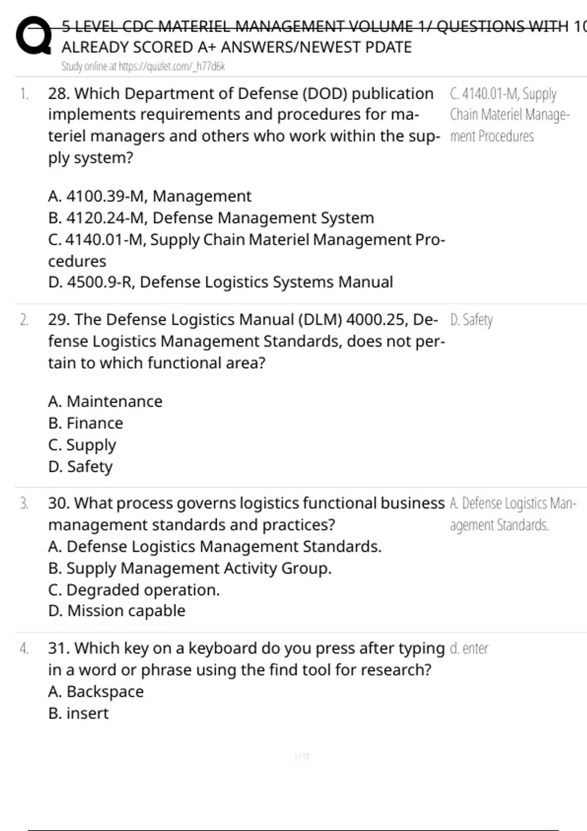 5 LEVEL CDC MATERIEL MANAGEMENT VOLUME 1/ QUESTIONS WITH 100% ALREADY SCORED A+ ANSWERS/NEWEST PDATE Study online at 1. 28. Which Department of Defense (DOD) publication implements requirements and procedures for ma teriel managers and others who work within the sup ply system? A. 4100.39-M, Management B. 4120.24-M, Defense Management System C. 4140.01-M, Supply Chain Materiel Management Pro cedures D. 4500.9-R, Defense Logistics Systems Manual C. 4140.01-M, Supply Chain Materiel Manage ment Procedures 2. 29. The Defense Logistics Manual (DLM) 4000.25, De fense Logistics Management Standards, does not per tain to which functional area? A. Maintenance B. Finance C. Supply D. Safety D. Safety 3. 30. What process governs logistics functional business management standards and practices? A. Defense Logistics Management Standards. B. Supply Management Activity Group. C. Degraded operation. D. Mission capable A. Defense Logistics Man agement Standards. 4. 31. Which key on a keyboard do you press after typing in a word or phrase using the find tool for research? A. Backspace B. insert d. enter 1 / 13 5 LEVEL CDC MATERIEL MANAGEMENT VOLUME 1/ QUESTIONS WITH 100% ALREADY SCORED A+ ANSWERS/NEWEST PDATE Study online at c. home d. enter 5. 32. What two entities make up the national stock num ber (NSN)? A. National item identification number (NIIN) and ma teriel management code (MMC) b. federal supply classification (fsc) and niin C FSC and MMC d. MMC and commercial and government entity (CGE) b. federal supply classifi cation (fsc) and niin