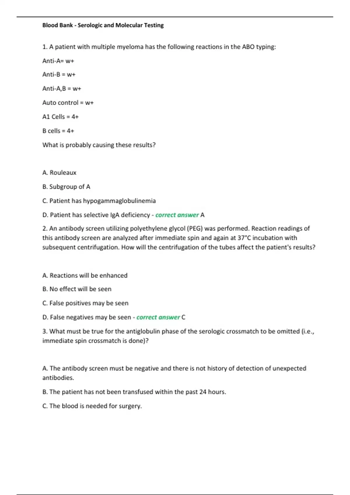 1. A patient with multiple myeloma has the following reactions in the ABO typing: