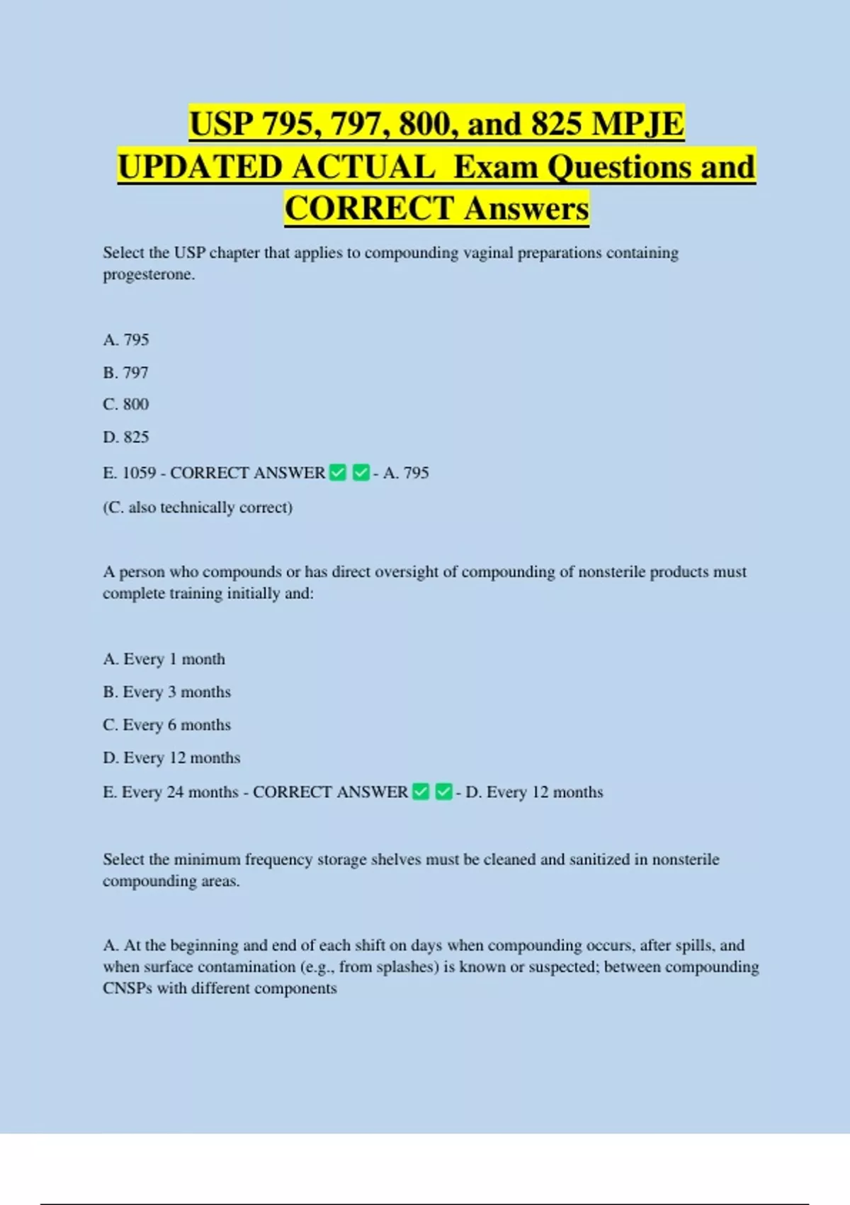 USP 795, 797, 800, and 825 MPJE UPDATED ACTUAL Exam Questions and CORRECT Answers Select the USP chapter that applies to compounding vaginal preparations containing progesterone. A. 795 B. 797 C. 800 D. 825 E. 1059 - CORRECT ANSWER (C. also technically correct) - A. 795