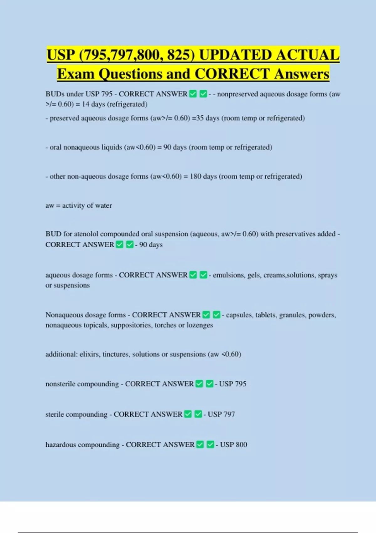 USP (795,797,800, 825) UPDATED ACTUAL Exam Questions and CORRECT Answers BUDs under USP 795 - CORRECT ANSWER /= 0.60) = 14 days (refrigerated) - - nonpreserved aqueous dosage forms (aw - preserved aqueous dosage forms (aw/= 0.60) =35 days (room temp or refrigerated) - oral nonaqueous liquids (aw0.60) = 90 days (room temp or refrigerated) - other non-aqueous dosage forms (aw0.60) = 180 days (room temp or refrigerated) aw = activity of wat