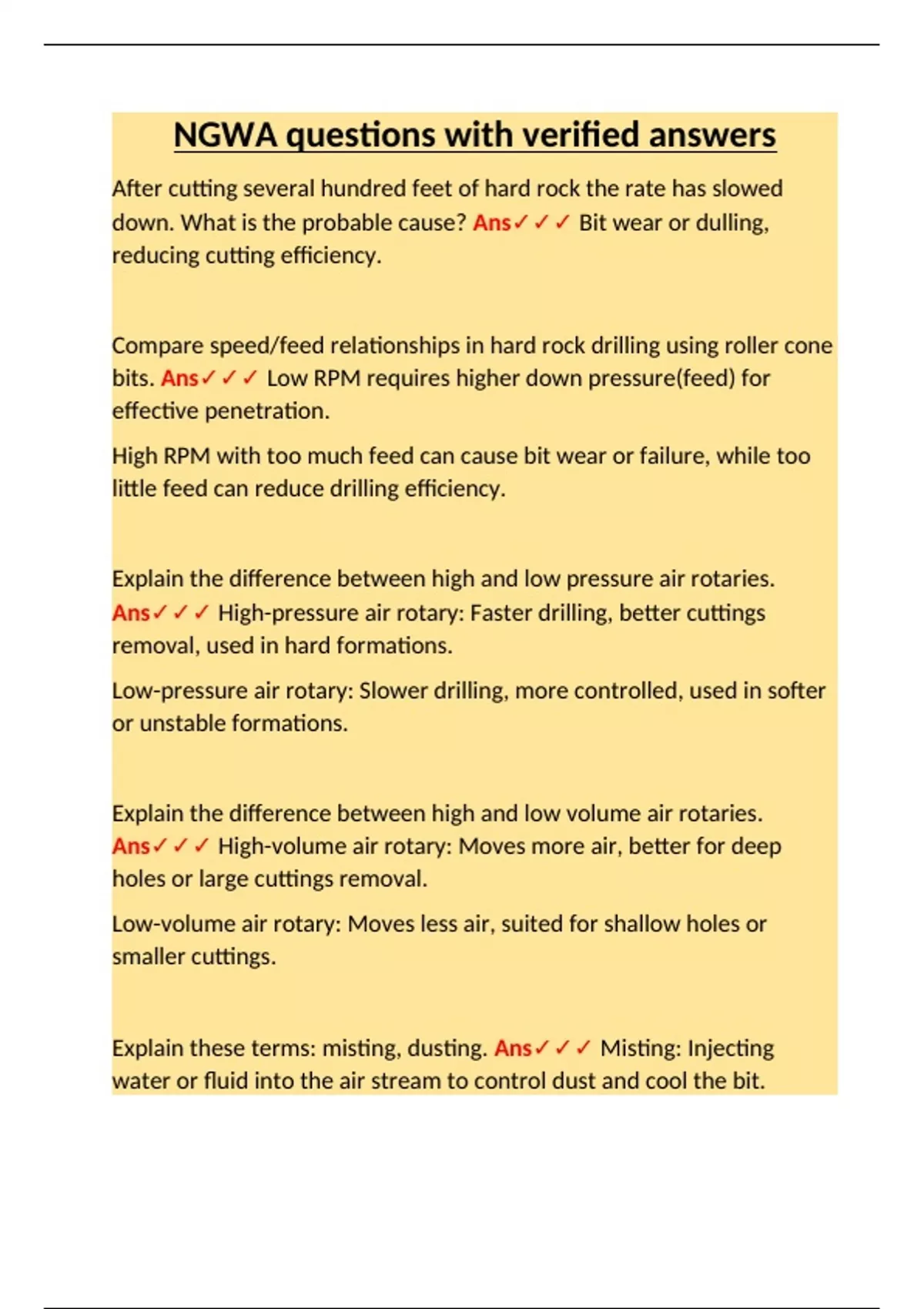 Comprehensive study guide for NGWA certification covering air rotary systems, drilling techniques, bit selection, down pressure, surfactants, and pressure-volume requirements. Includes accurate answers to high-yield technical questions.