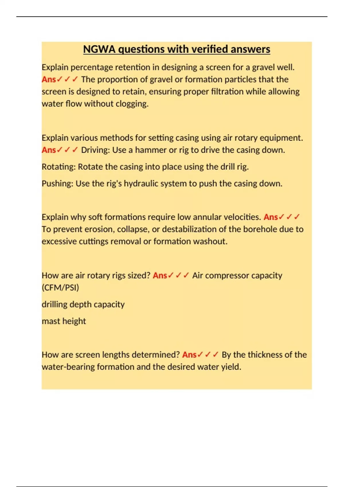 Comprehensive NGWA exam preparation covering groundwater monitoring, well design, drilling methods, mud rotary and air rotary systems, screen installation, and drilling fluid management with verified answers.