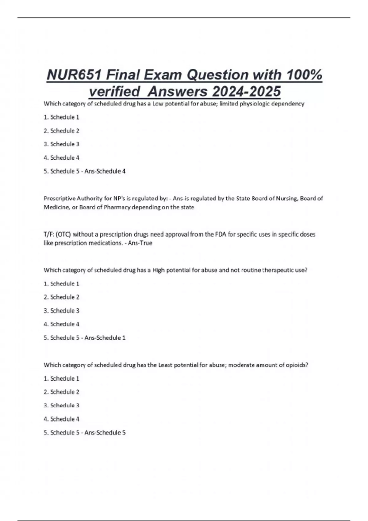 Which category of scheduled drug has a Low potential for abuse; limited physiologic dependency 1. Schedule 1 2. Schedule 2 3. Schedule 3 4. Schedule 4 5. Schedule 5 - Ans-Schedule 4 Prescriptive Authority for NP's is regulated by: - Ans-is regulated by the State Board of Nursing, Board of Medicine, or Board of Pharmacy depending on the state T/F: (OTC) without a prescription drugs need approval from the FDA for specific uses in specific doses like prescription medications. - Ans-True Which category of scheduled drug has a High potential for abuse and not routine therapeutic use?,,,,,,