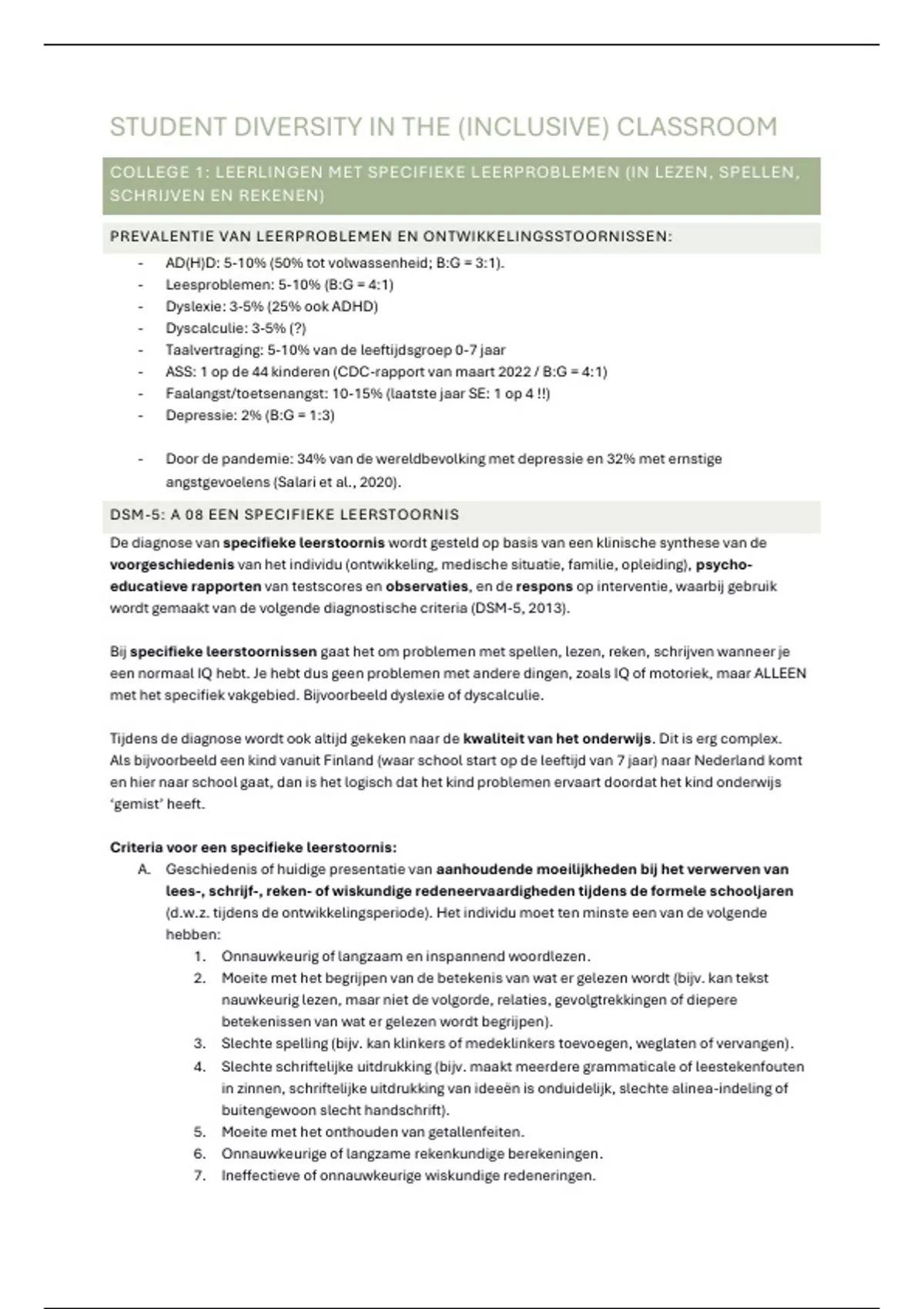 Samenvatting van de tentamenstof van het vak Student Diversity in the (inclusive) Classroom. De samenvatting is aangevuld met aantekeningen vanuit het college.