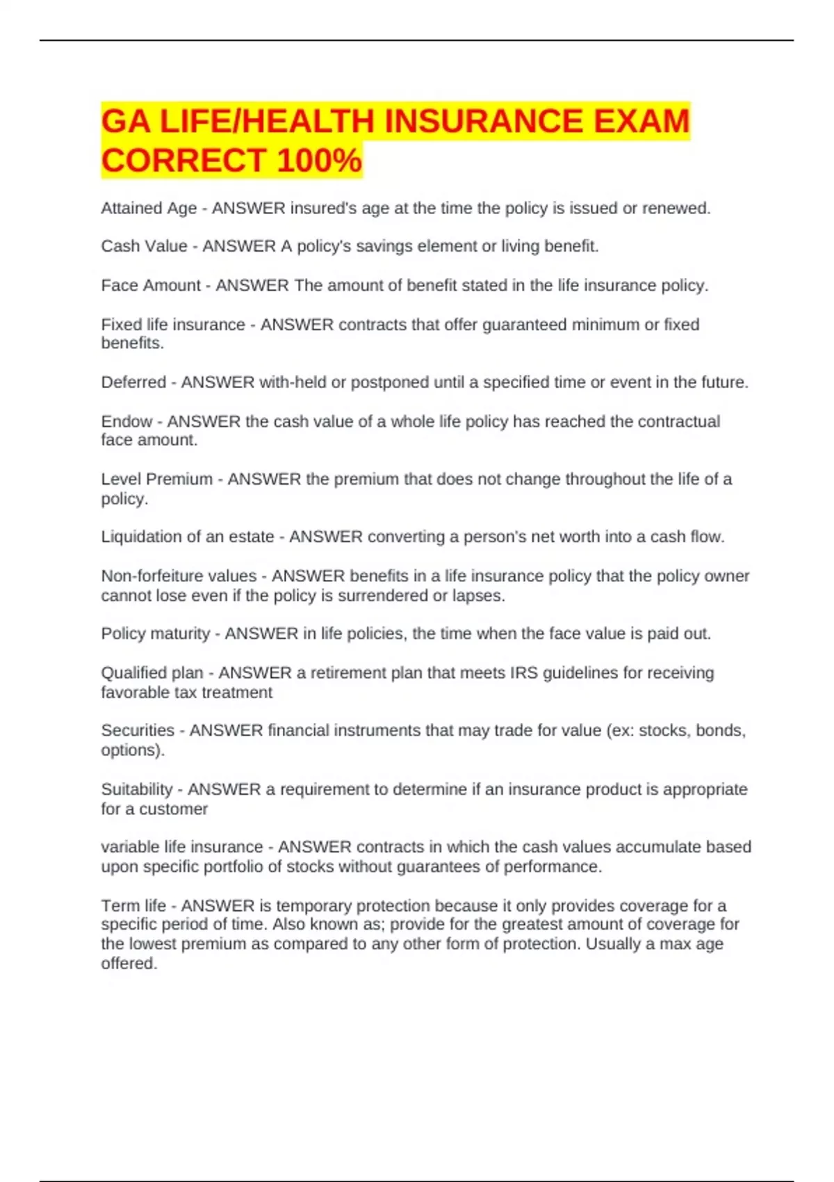 GA LIFE/HEALTH INSURANCE EXAM CORRECT 100%