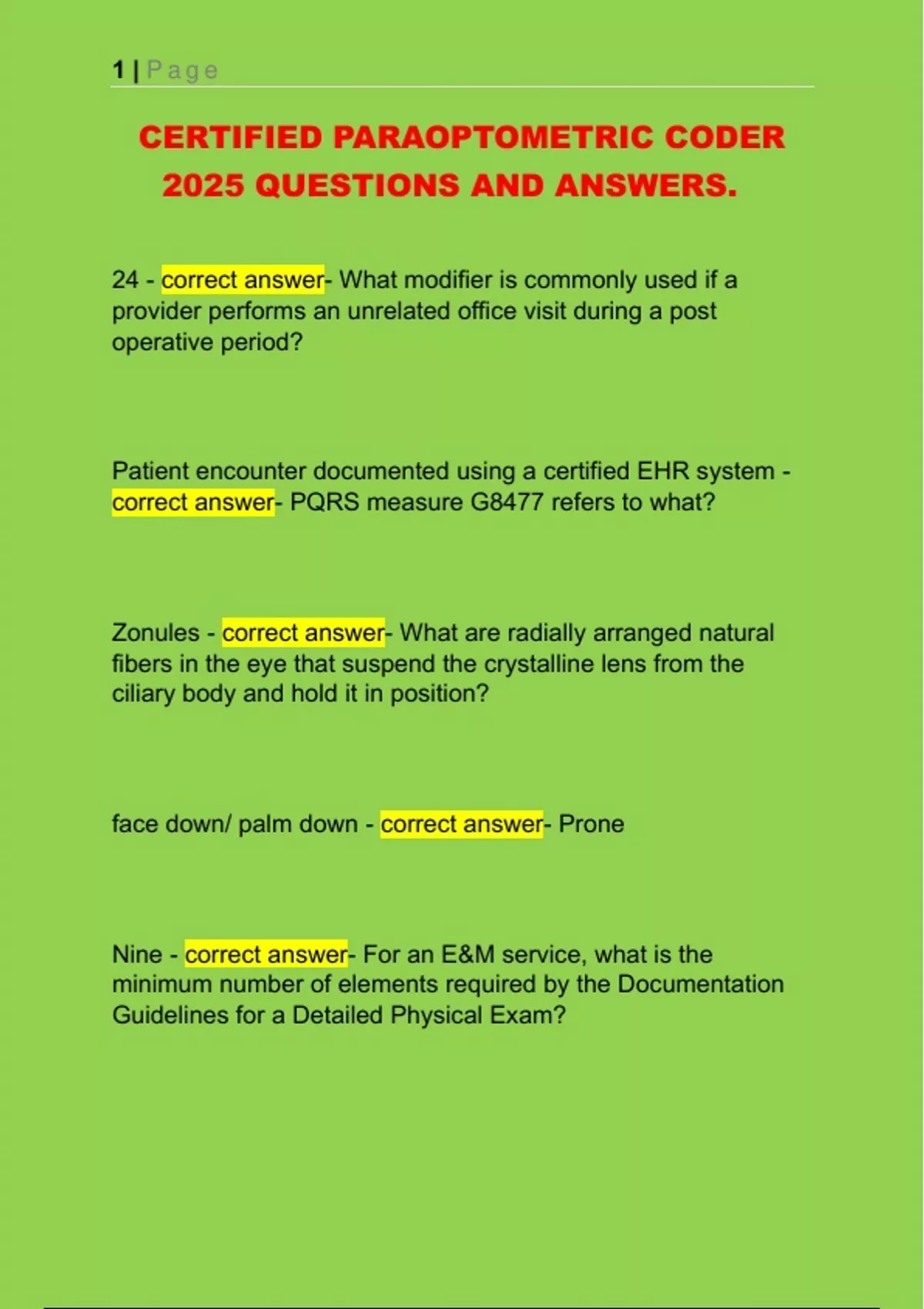 This 2025 Certified Paraoptometric Coder (CPC) Exam guide provides a complete set of verified questions and correct answers. It covers medical coding practices, ophthalmic anatomy, CPT/ICD-10/HCPCS coding, PQRS measures, E&M documentation, modifiers (e.g., 24, 25, 51, 52), billing procedures, post-cataract eyewear rules, Medicare documentation, and optometric clinical terms. Also includes medical prefixes, suffixes, and insurance claim protocols essential for paraoptometric coders.
