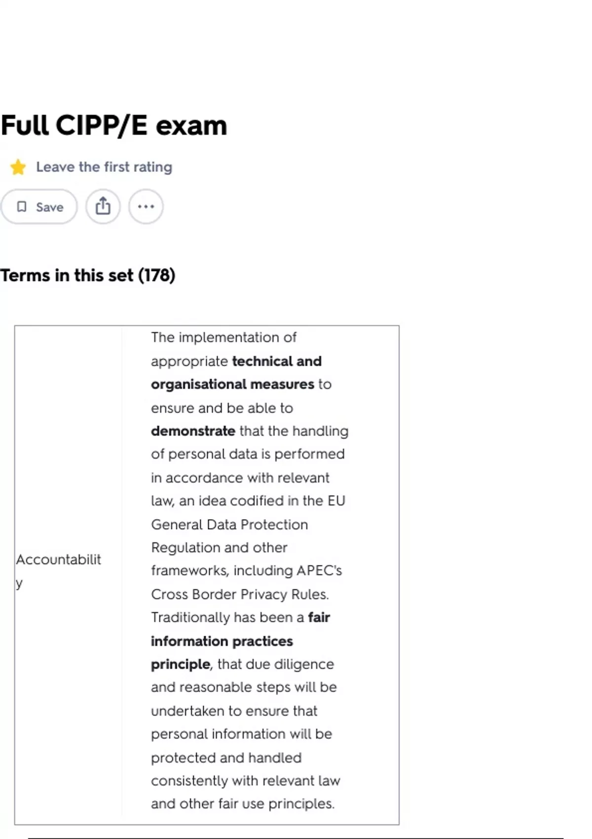 Full CIPP/E exam Leave the first rating Save Terms in this set (178) Accountabilit y The implementation of appropriate technical and organisational measures to ensure and be able to demonstrate that the handling of personal data is performed in accordance with relevant law, an idea codified in the EU General Data Protection Regulation and other frameworks, including APEC's Cross Border Privacy Rules. Traditionally has been a fair information practices principle, that due diligence and reasonable steps will be undertaken to ensure that personal information will be protected and handled consistently with relevant law and other fair use principles. Accuracy Organizations must take every reasonable step to ensure the data processed is this and, where necessary, kept up to date. Reasonable measures should be understood as implementing processes to prevent inaccuracies during the data collection process as well as during the ongoing data processing in relation to the specific use for which the data is processed. The organization must consider the type of data and the specific purposes to maintain the accuracy of personal data in relation to the purpose. Also embodies the responsibility to respond to data subject requests to correct records that contain incomplete information or misinformation. Adequate Level of Protection A transfer of personal data from the European Union to a third country or an international organisation may take place where the European Commission has decided that the third country, a territory or one or more specified sectors within that third country, or the international organisation in question, ensures this by taking into account the following elements: (a) the rule of law, respect for human rights and fundamental freedoms, both general and sectoral legislation, data protection rules, professional rules and security measures, effective and enforceable data subject rights and effective administrative and judicial redress for the data subjects whose personal data is being transferred; (b) the existence and effective functioning of independent supervisory authorities with responsibility for ensuring and enforcing compliance with the data protection rules; (c) the international commitments the third country or international organisation concerned has entered into in relation to the protection of personal data.