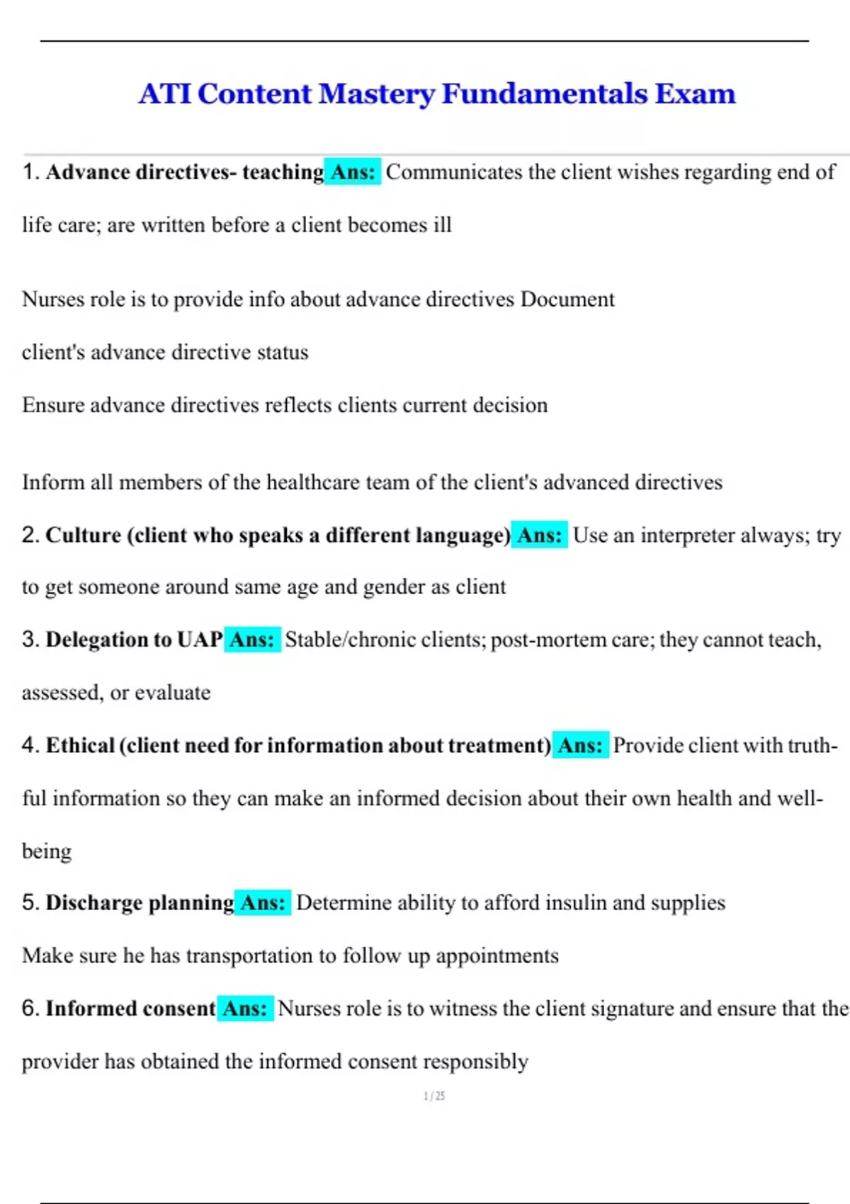 6. Informed consent Ans: Nurses role is to witness the client signature and ensure that the