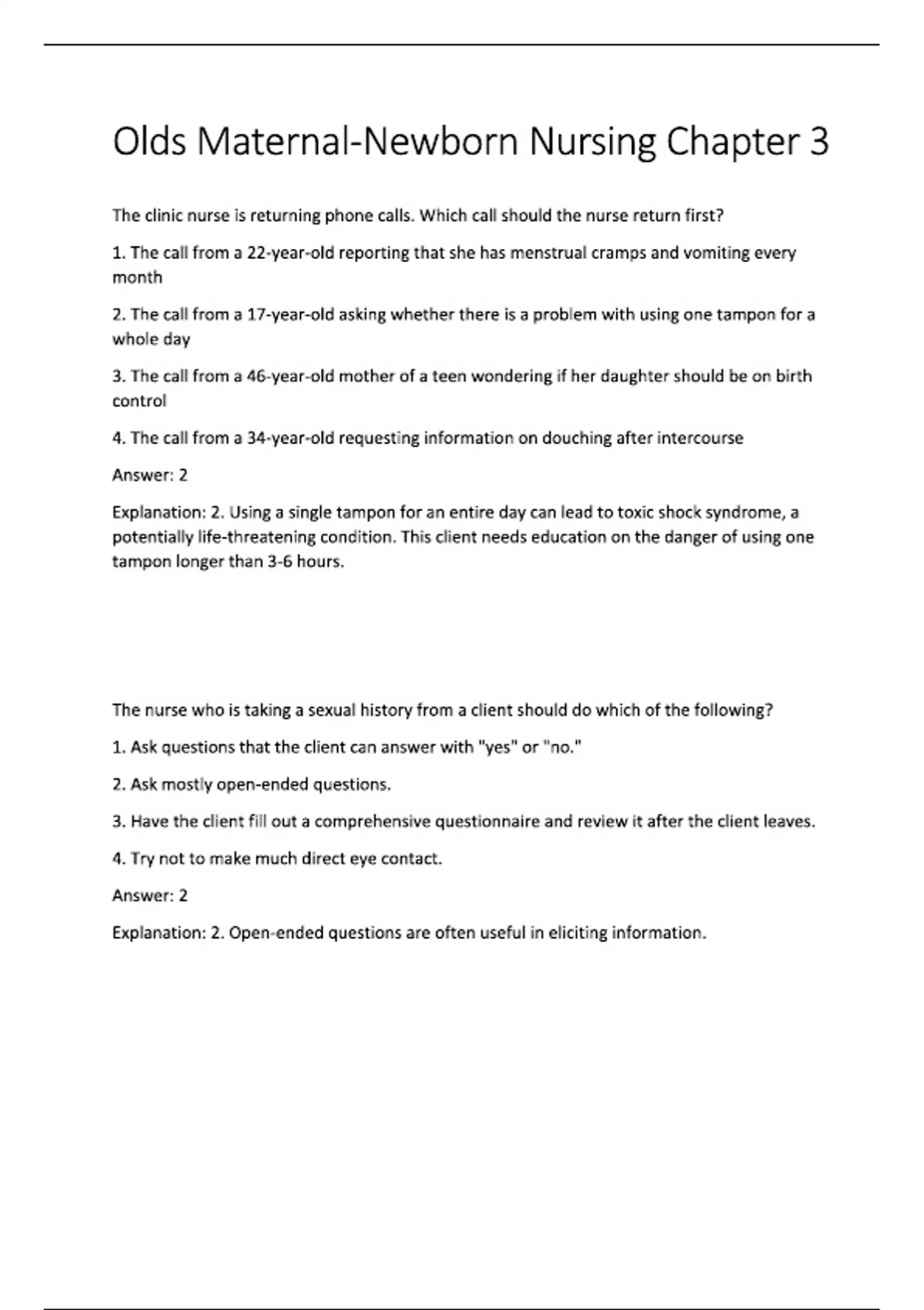 Olds Maternal-Newborn Nursing Chapter 3 Questions (All correct answers, Already graded A+) Exam 2025/2026