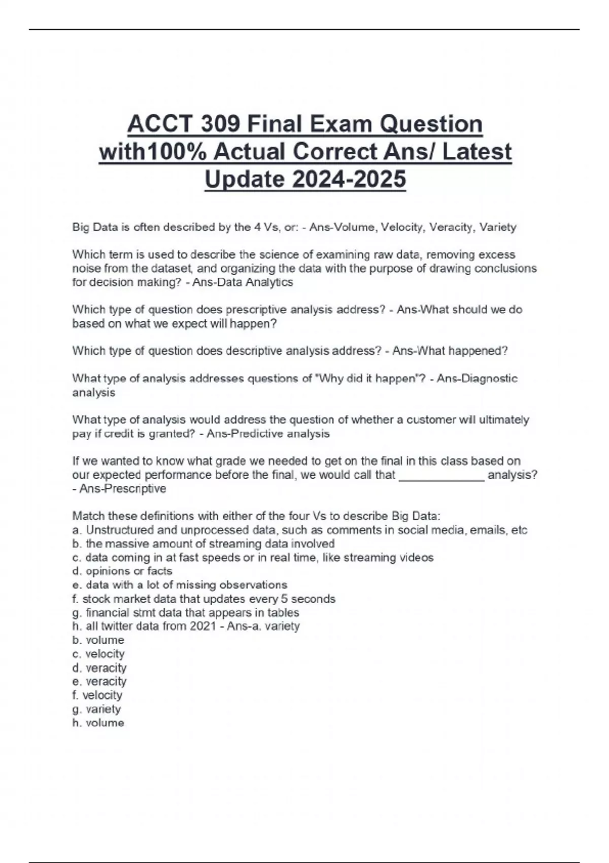 Big Data is often described by the 4 Vs, or: - Ans-Volume, Velocity, Veracity, Variety Which term is used to describe the science of examining raw data, removing excess noise from the dataset, and organizing the data with the purpose of drawing conclusions for decision making? - Ans-Data Analytics Which type of question does prescriptive analysis address? - Ans-What should we do based on what we expect will happen? Which type of question does descriptive analysis address? - Ans-What happened? What type of analysis addresses questions of "Why did it happen"? - Ans-Diagnostic analysis What type of analysis would address the question of whether a customer will ultimately pay if credit is granted? - Ans....