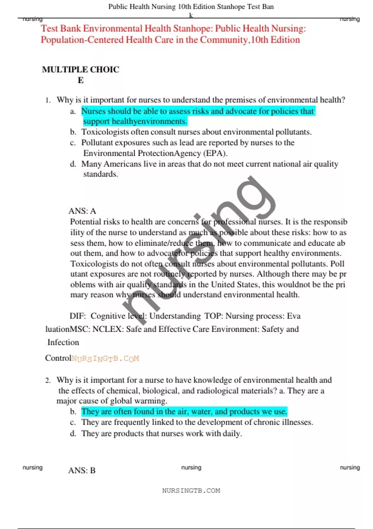 TestgBankgEnvironmentalgHealthgStanhope:gPublicgHealthgNursing:g